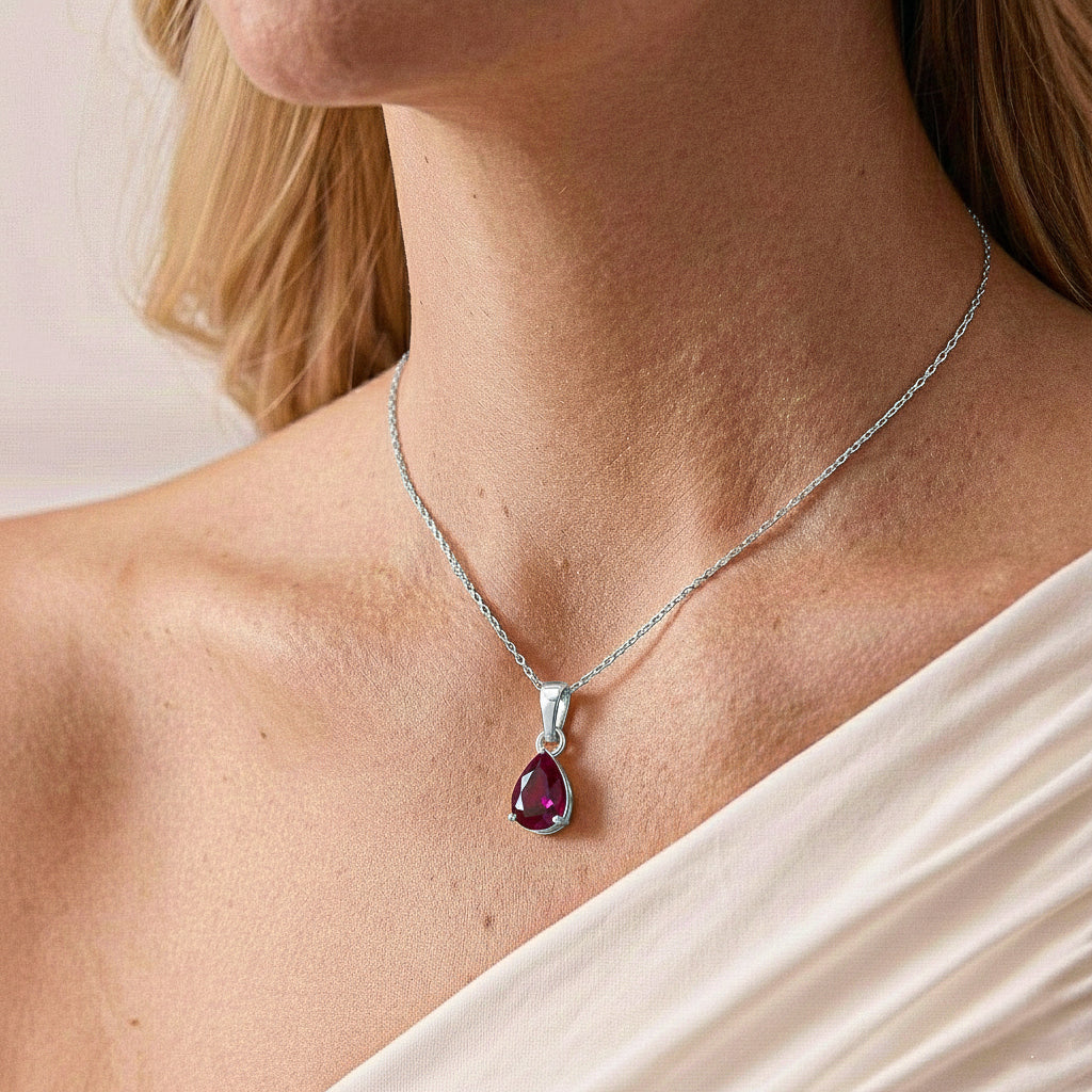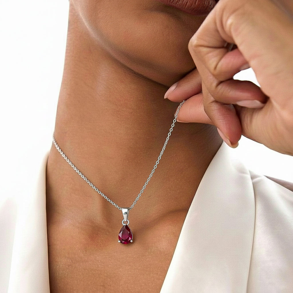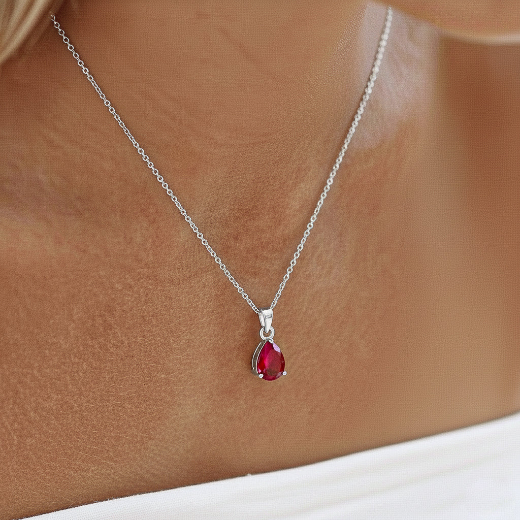 Make a statement with this Ruby pear-shaped solitaire teardrop pendant necklace crafted in genuine 925 sterling silver. Featuring a 9x7 mm faceted ruby gemstone (approx. 1.4 carat), this pendant radiates deep red brilliance and timeless elegance. Measuring 18.40 x 7 mm, it includes a 16” + 2” adjustable sterling silver cable chain secured with a lobster clasp. Perfect for everyday sophistication, July birthstone gifts, or special occasions.