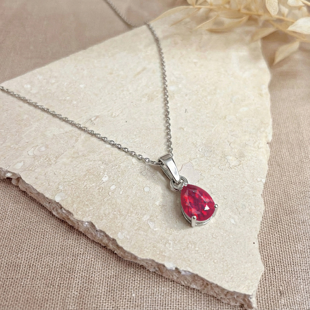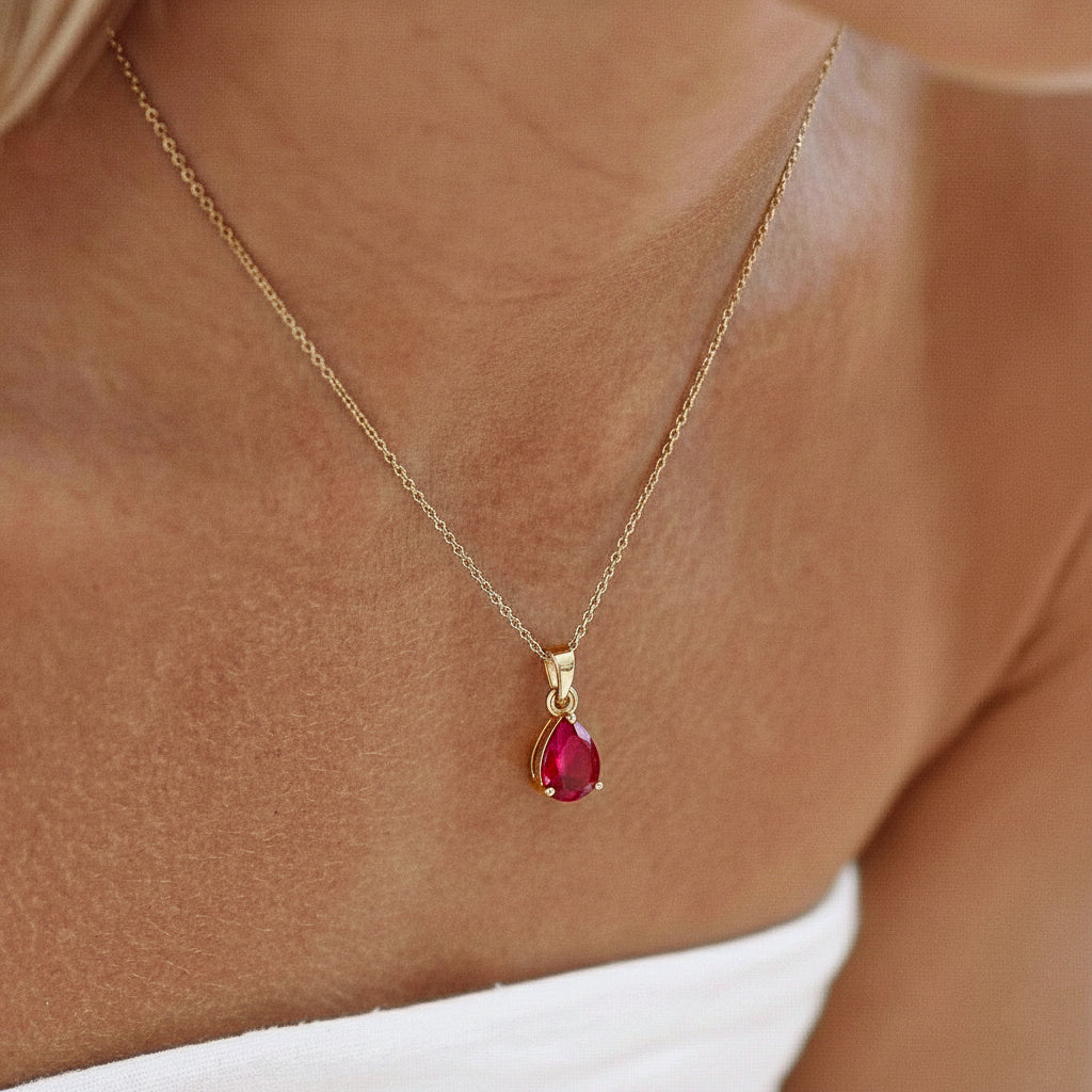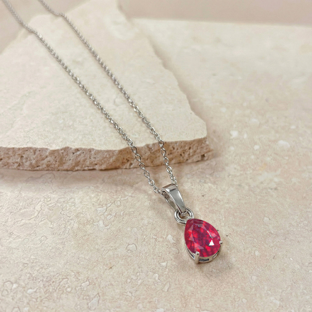 Make a statement with this Ruby pear-shaped solitaire teardrop pendant necklace crafted in genuine 925 sterling silver. Featuring a 9x7 mm faceted ruby gemstone (approx. 1.4 carat), this pendant radiates deep red brilliance and timeless elegance. Measuring 18.40 x 7 mm, it includes a 16” + 2” adjustable sterling silver cable chain secured with a lobster clasp. Perfect for everyday sophistication, July birthstone gifts, or special occasions.