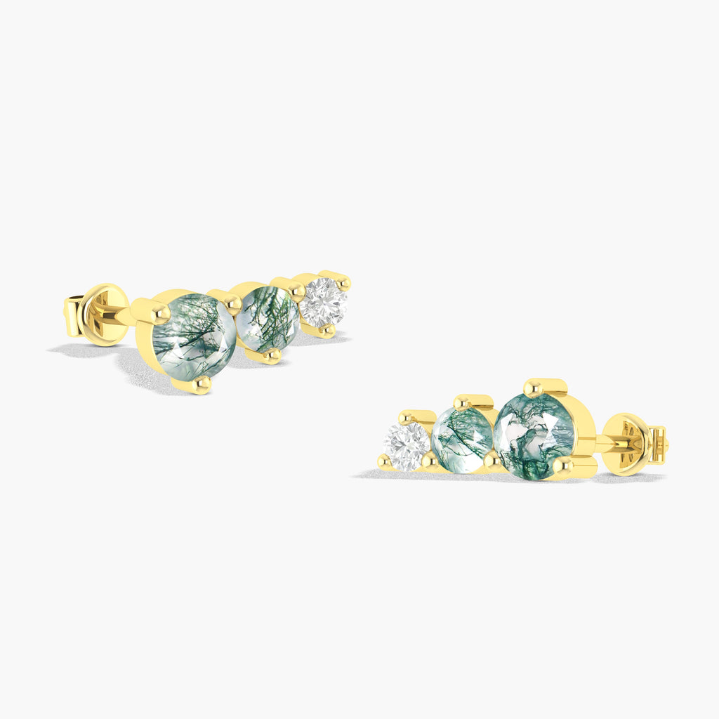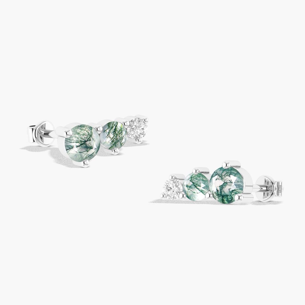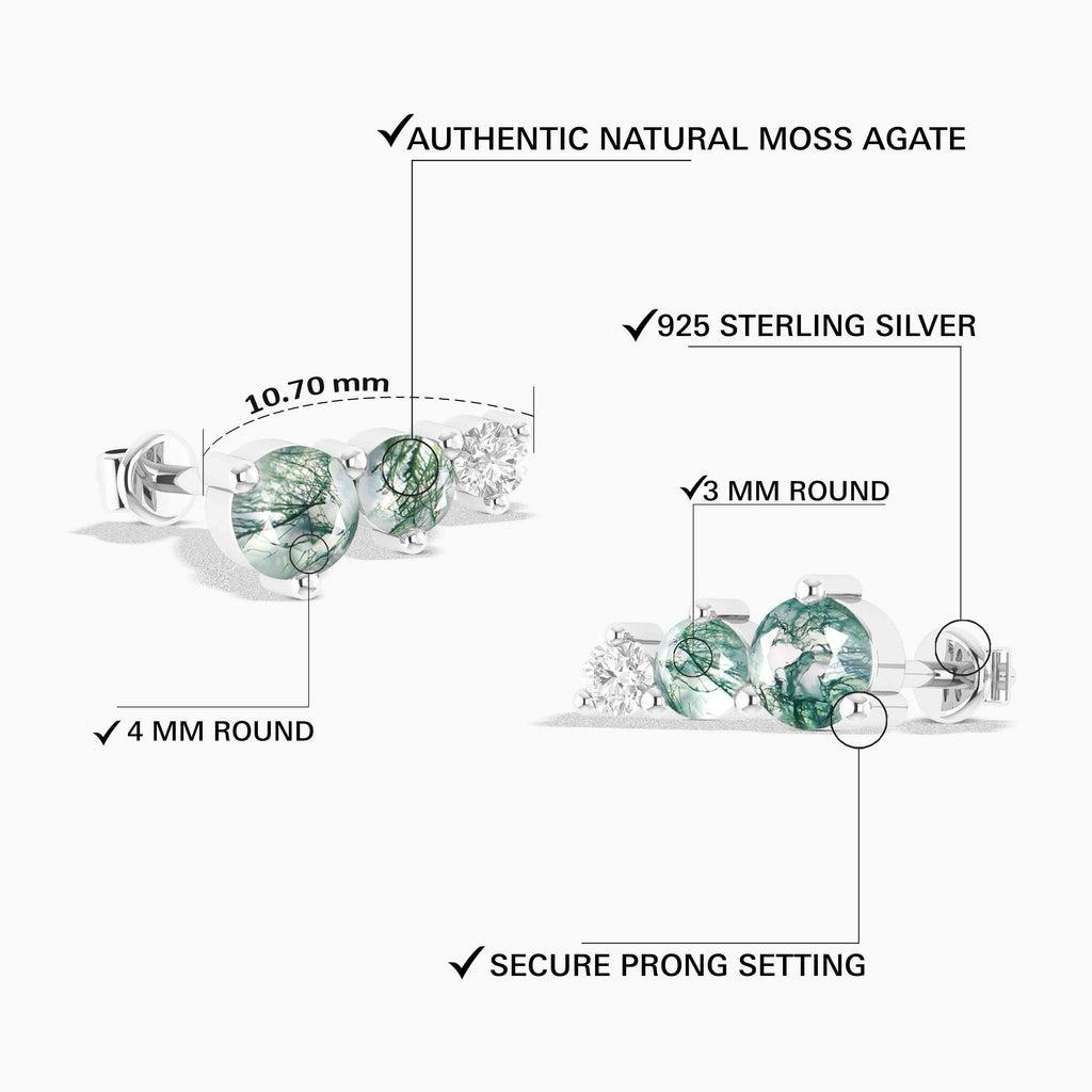 Moss AgateElegant moss agate round stud earrings crafted in 925 sterling silver, featuring 4mm and 3mm moss agate stones accented with 2mm sparkling CZ. Total 1.5ct weight with a secure push-back closure. Lightweight and stylish, perfect for everyday wear or adding subtle charm.