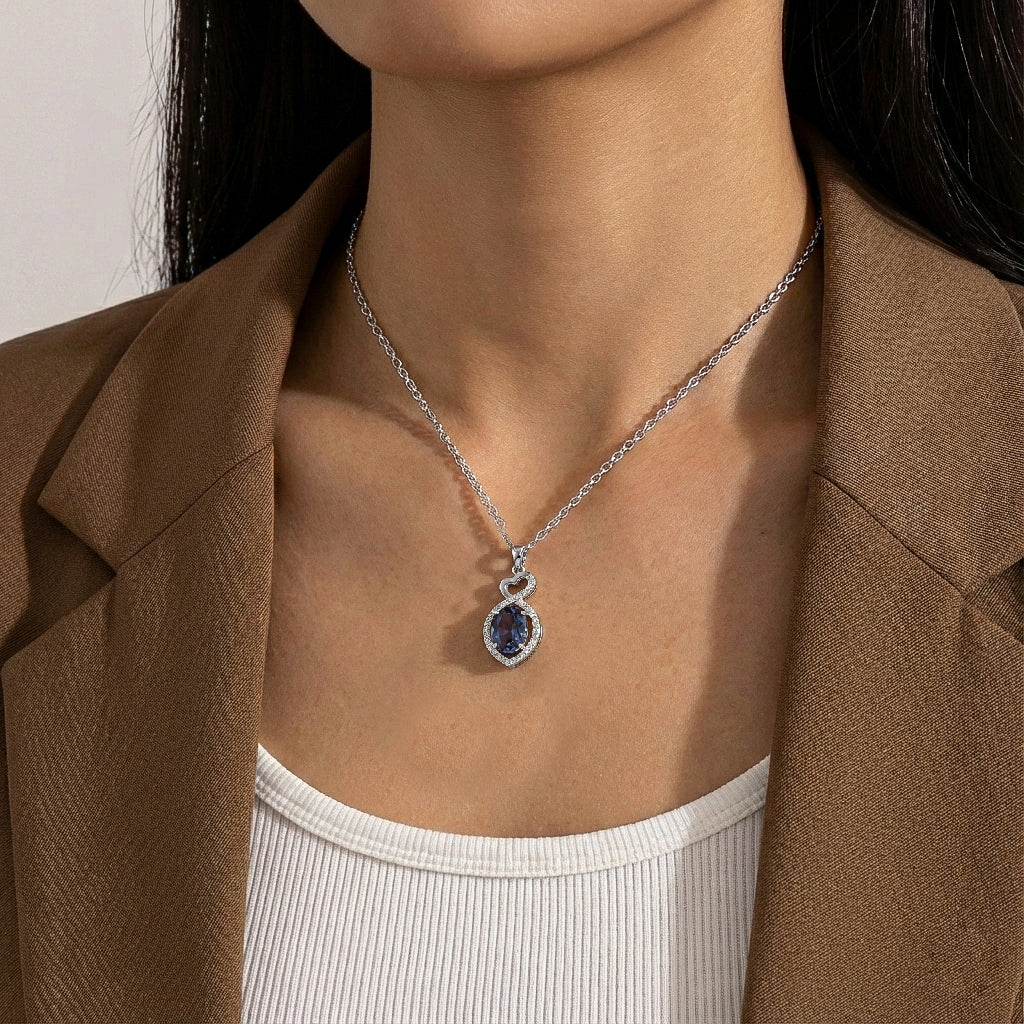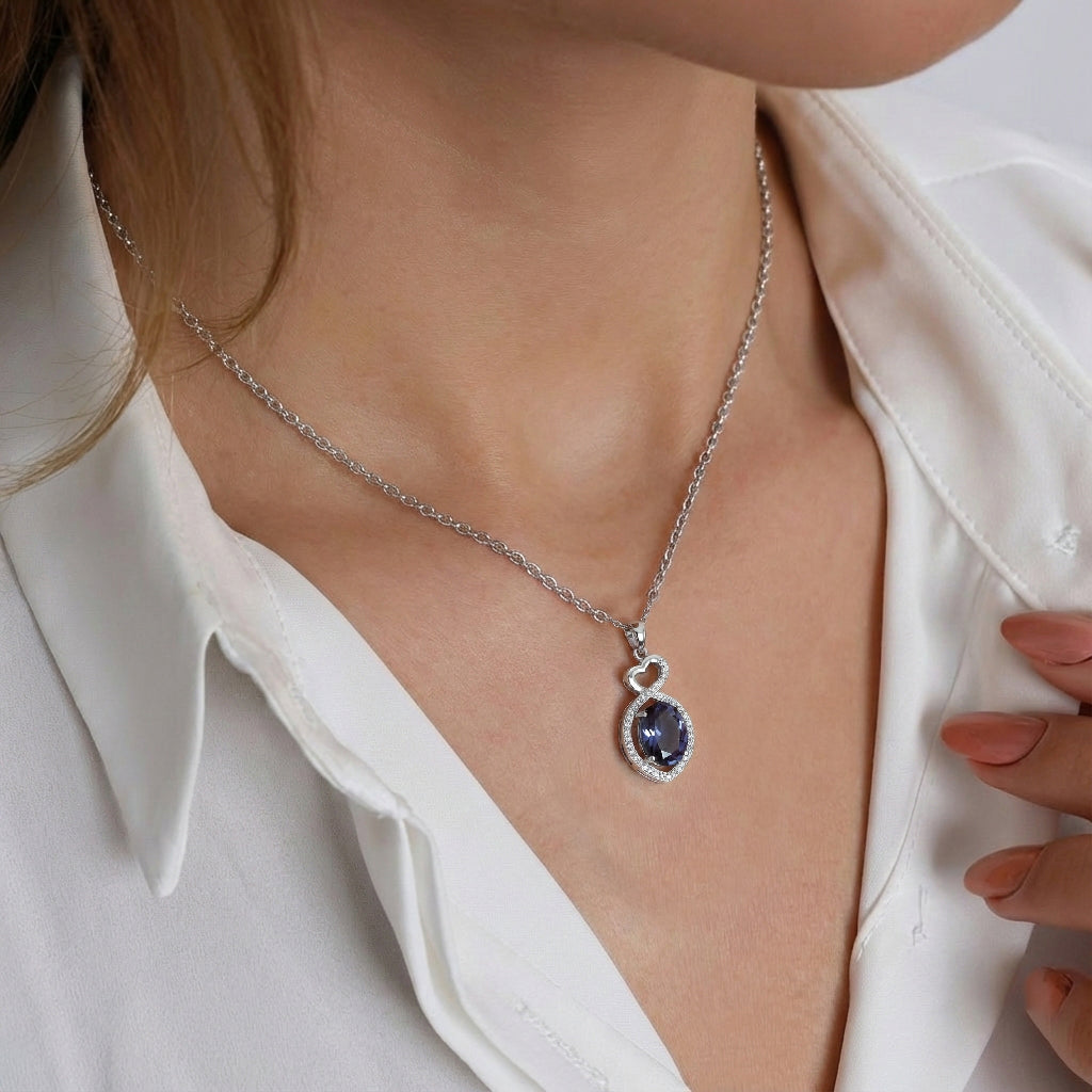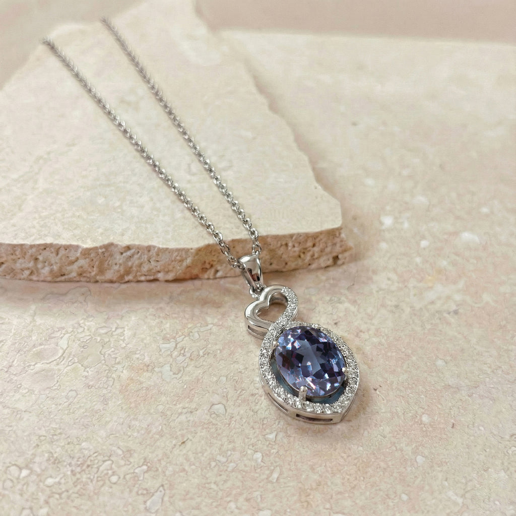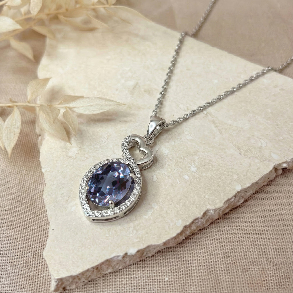 Alexandrite Oval Infinity Twist Heart Pendant Necklace in 925 Sterling Silver features a 1.2ct oval-cut alexandrite (8x6mm) set within a unique infinity twist heart design, accented with 2ct cubic zirconia for extra sparkle. The pendant measures 24.55 x 11.64mm and hangs elegantly from a 16” + 2” adjustable cable chain with a secure lobster clasp. Crafted from premium sterling silver, this romantic and eye-catching necklace offers color-changing brilliance, timeless elegance, and everyday comfort—perfect for gifting or making a stylish statement.