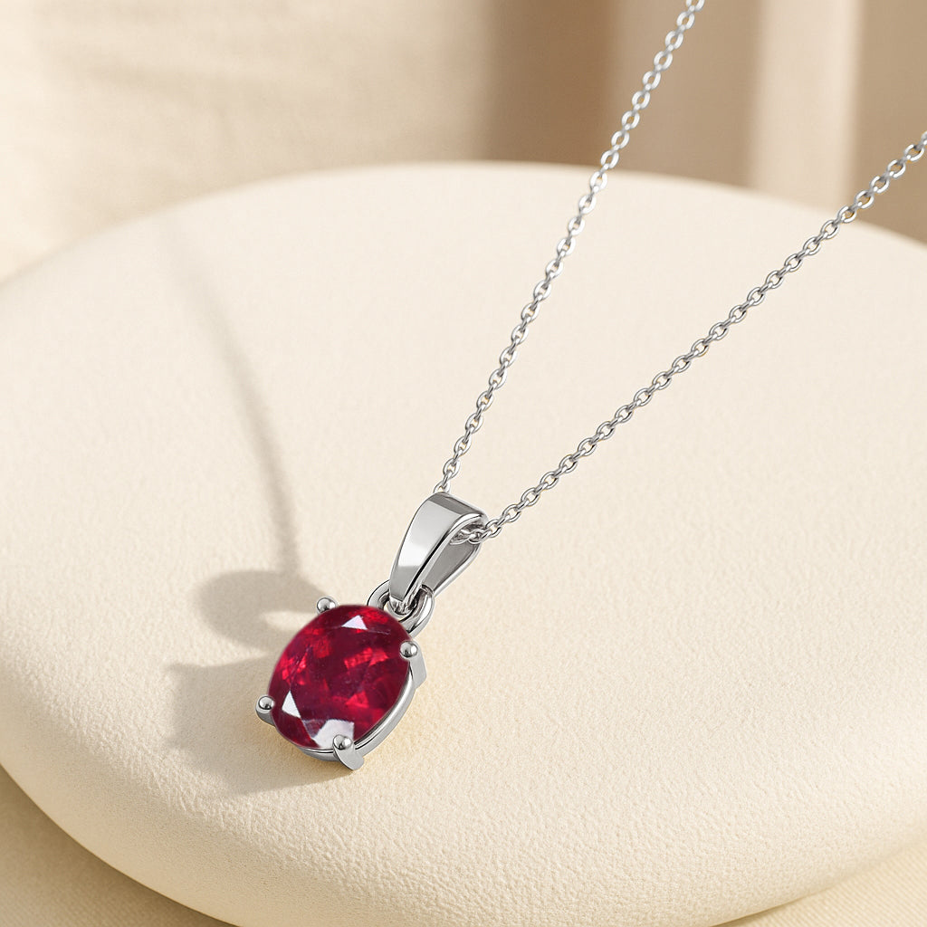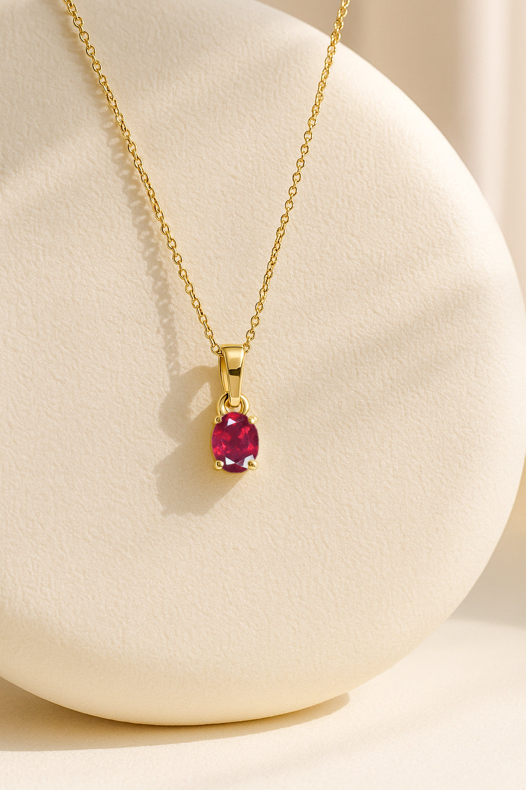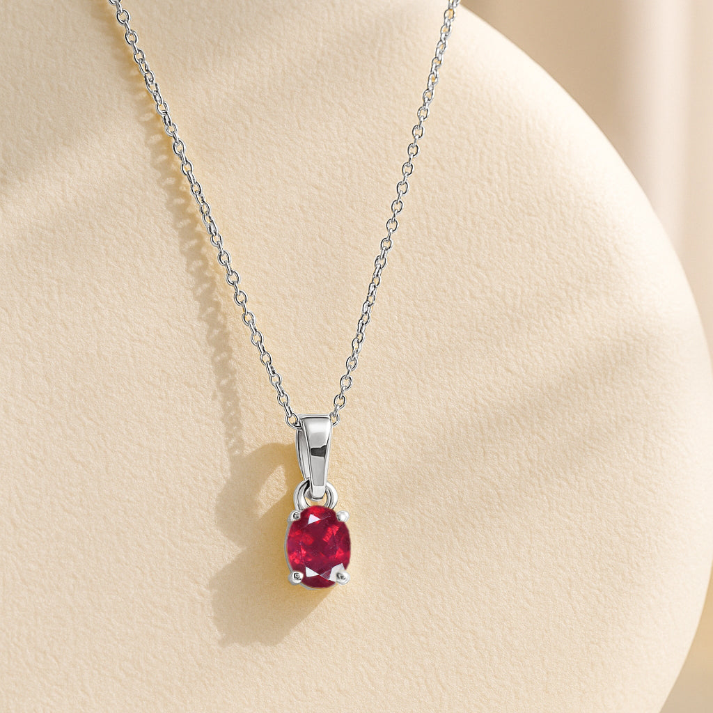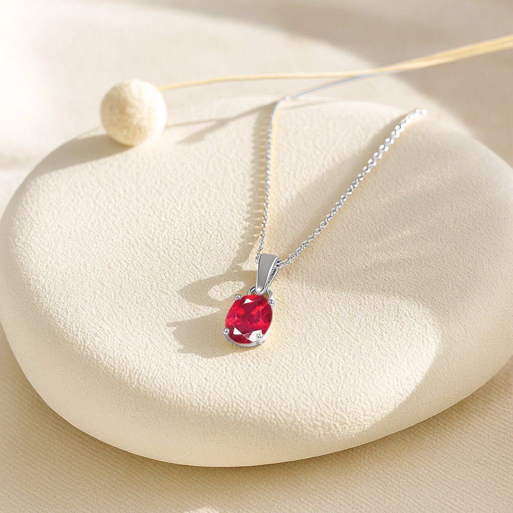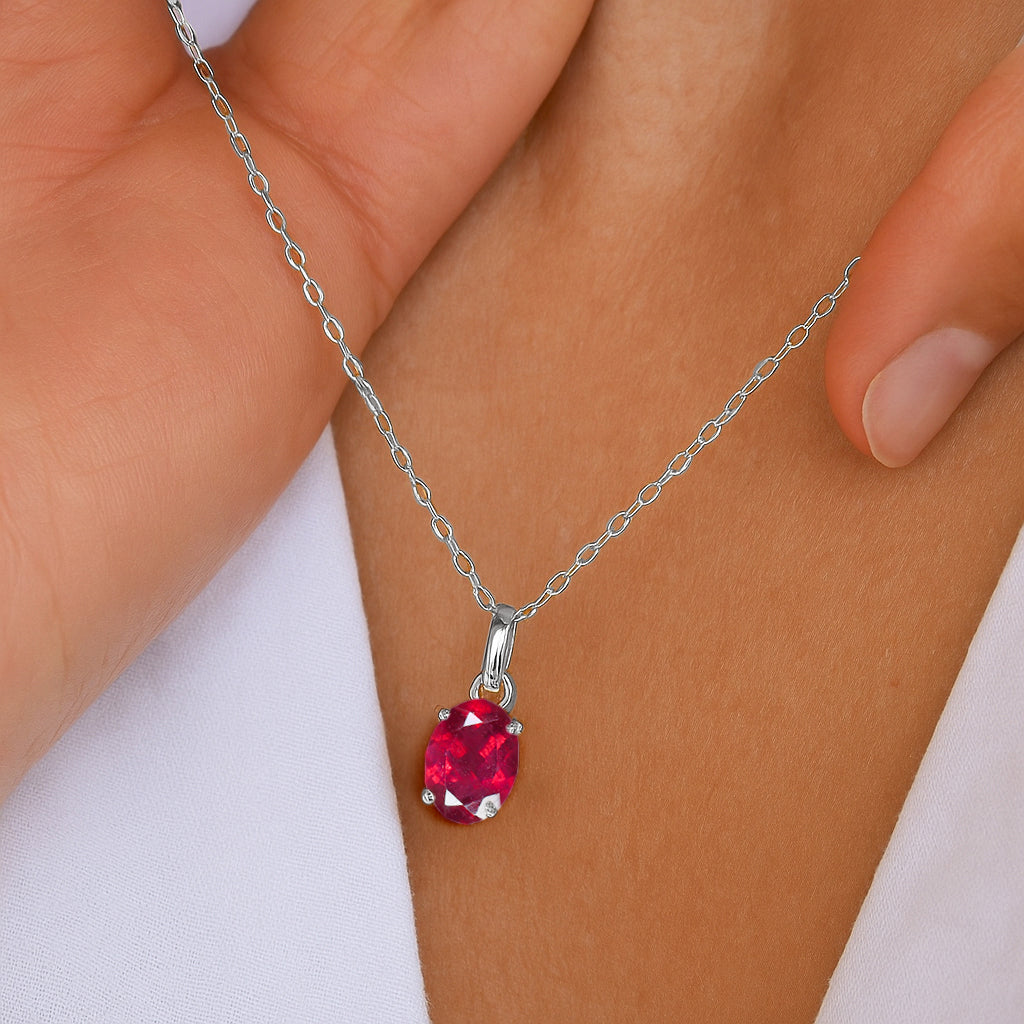 Elevate your elegance with this Ruby solitaire pendant necklace crafted in genuine 925 sterling silver. Featuring a 9x7 mm oval faceted ruby gemstone (approx. 1.4 carat), this classic pendant radiates deep red brilliance and timeless style. The pendant measures 17.70 x 7 mm and comes with a 16” + 2” adjustable sterling silver cable chain secured with a lobster clasp. Perfect for everyday wear, July birthstone gifts, or special occasions.
