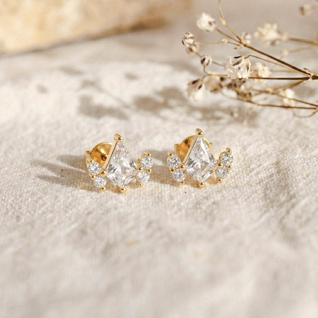 These Simulated Diamond Kite Stud Earrings in 925 Sterling Silver feature 6x4 MM kite-shaped faceted stones with approx. 1 carat total weight. Designed with a sleek geometric silhouette, the earrings measure 7.83 x 6.86 MM and weigh 1.05 GM. Classic clear stone studs are ideal for wedding jewelry, anniversary gifts, or everyday sterling silver earrings.