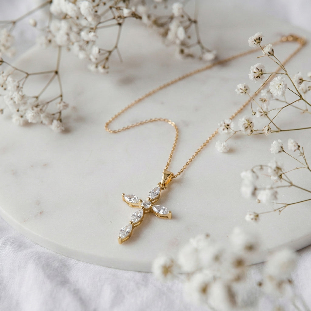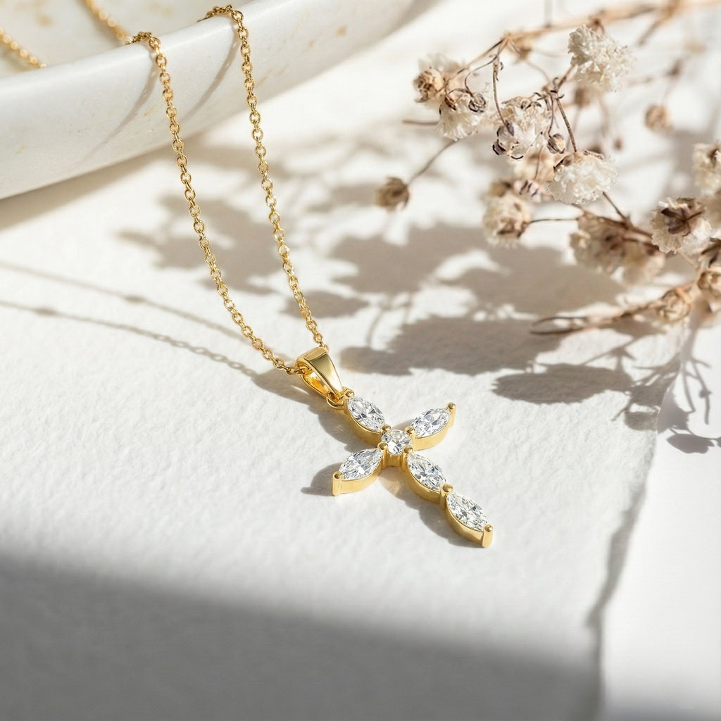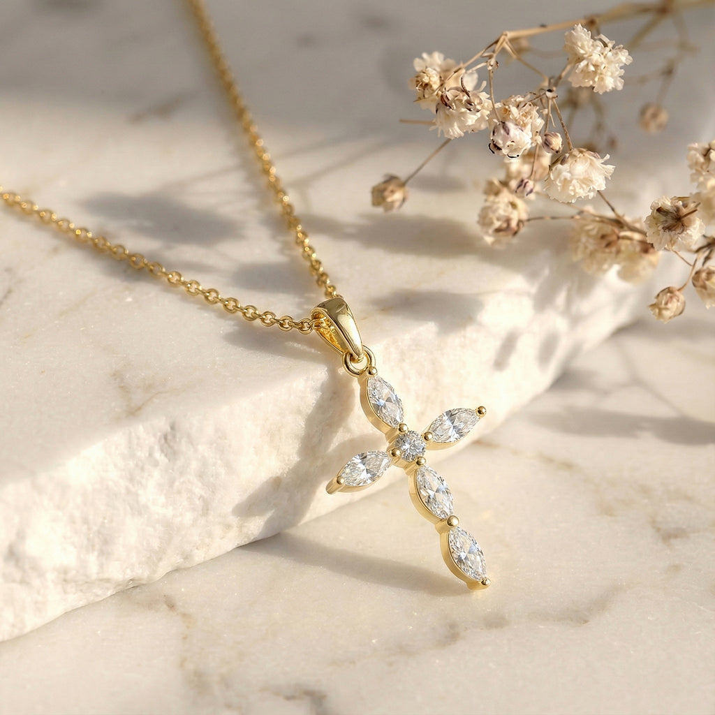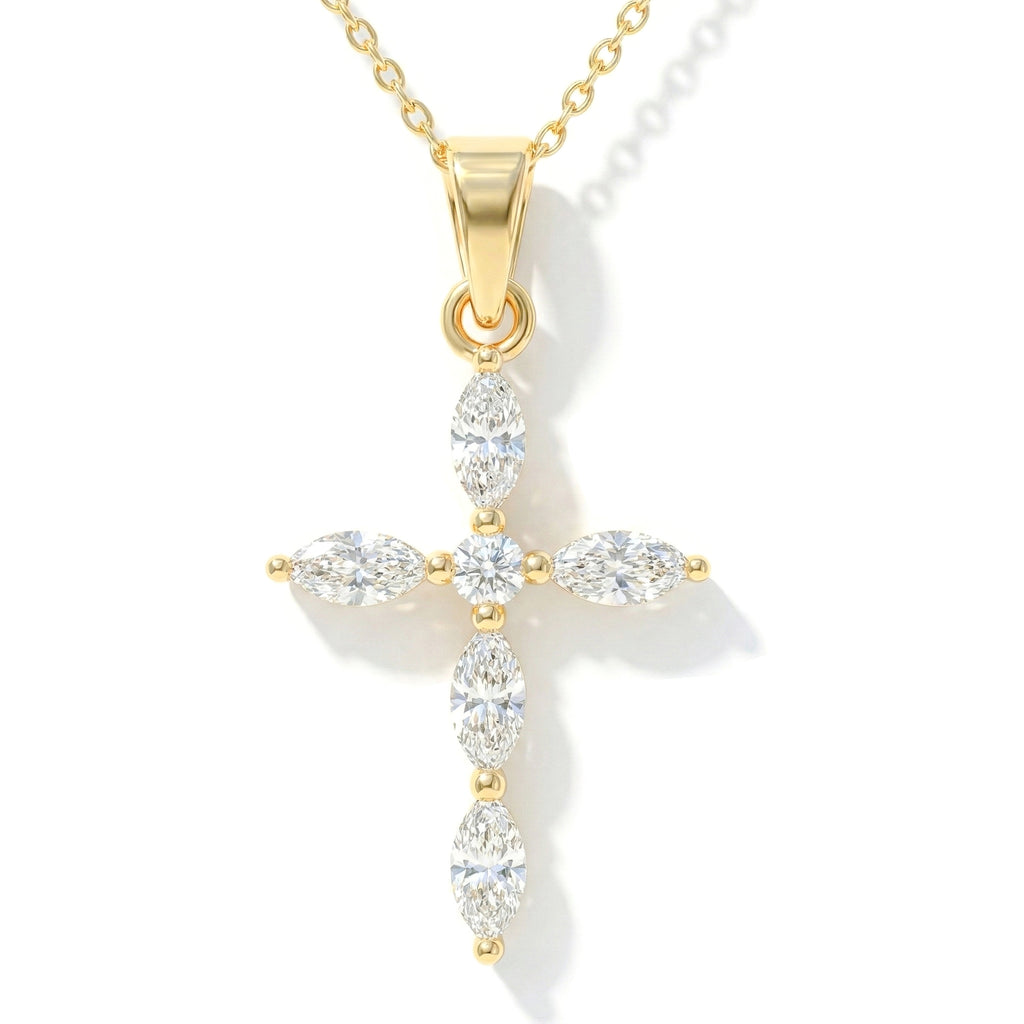 Shine with timeless elegance in this cross pendant necklace featuring five faceted marquise-cut simulated diamonds set in yellow gold plated brass. With a total carat weight of approximately 2 CT, the sparkling stones create a brilliant, eye-catching effect. The pendant measures 27.29 x 14.69 mm and hangs from a 16” + 2” adjustable cable chain with a secure lobster clasp. Lightweight yet striking, this necklace is perfect for layering or as a meaningful statement piece.