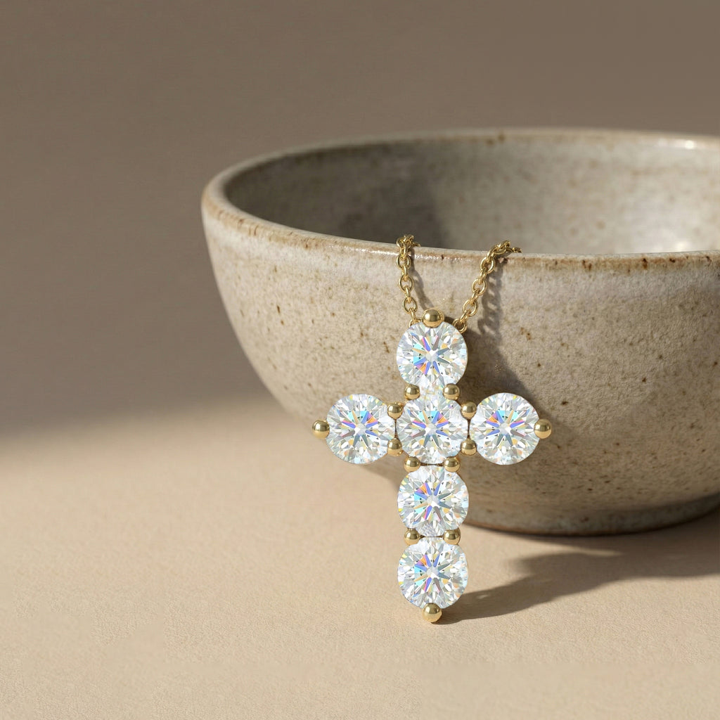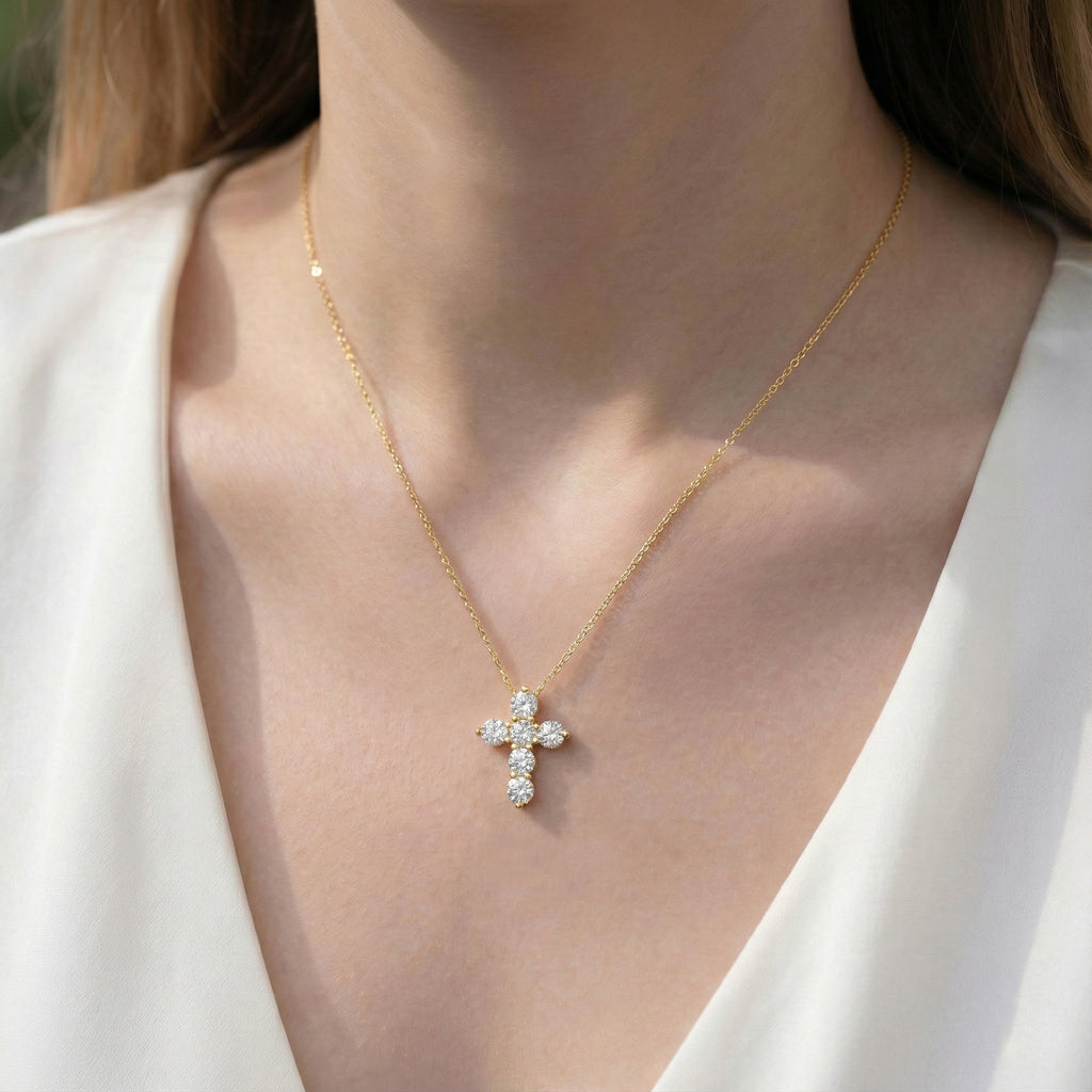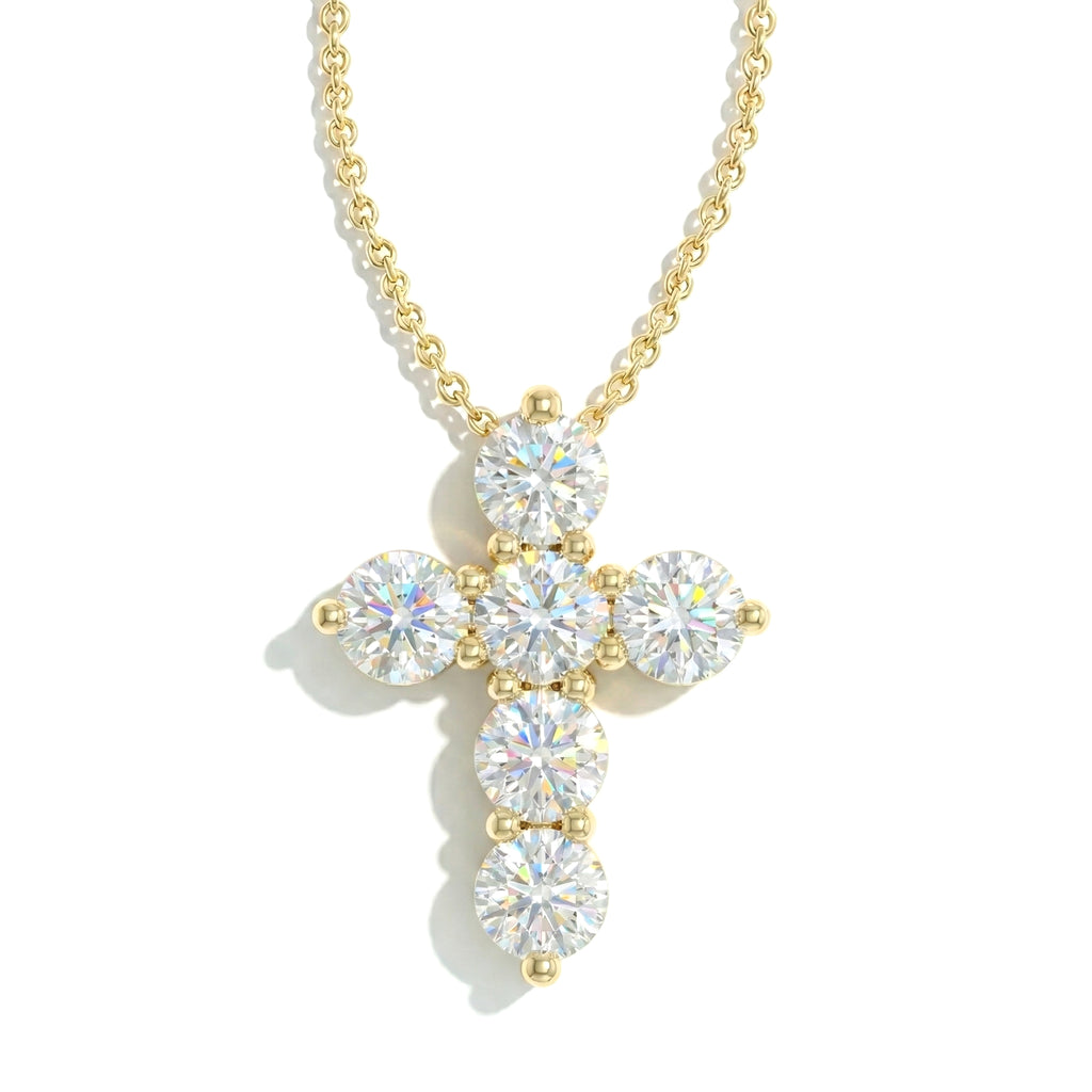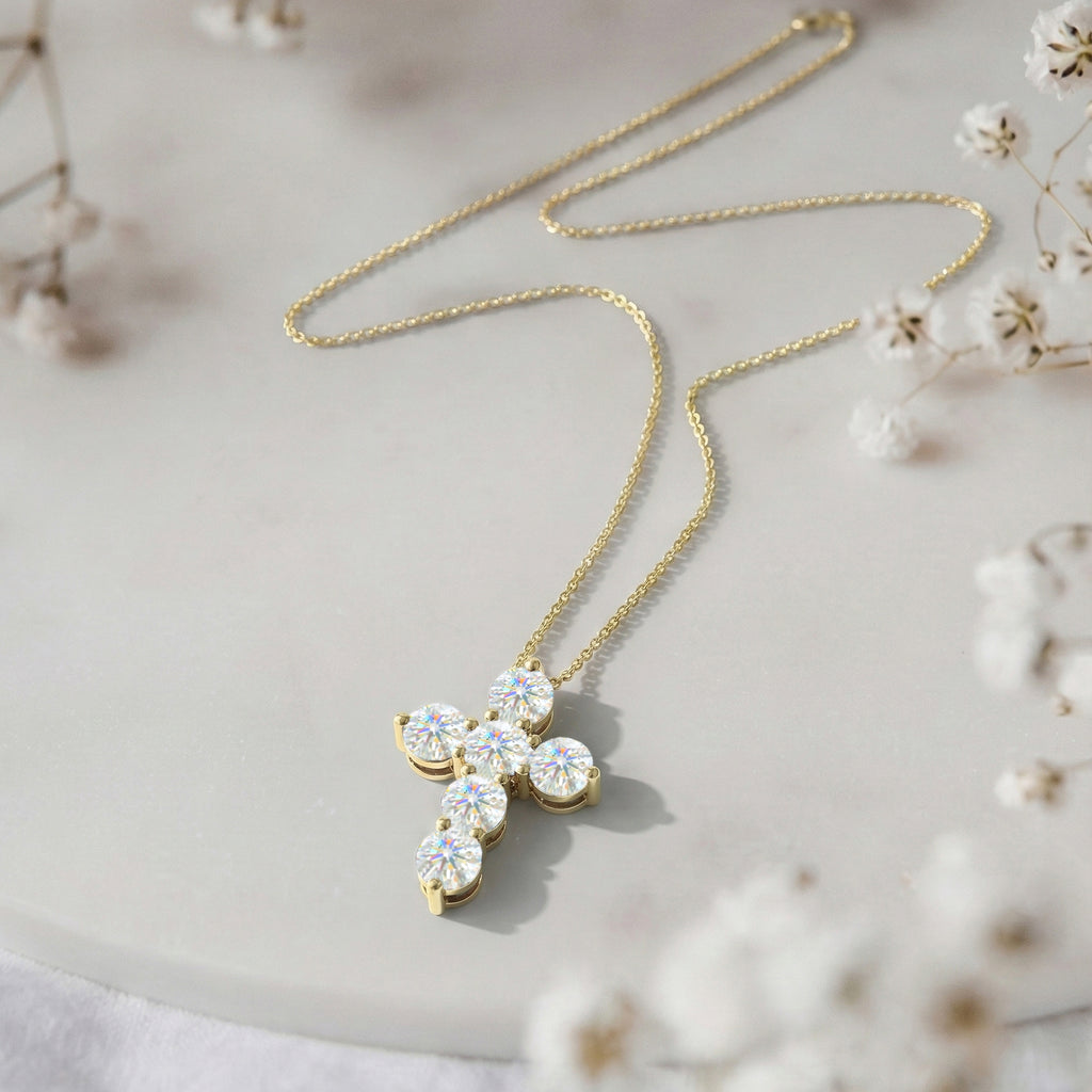 Sparkling and timeless, this cross pendant necklace features six faceted round simulated diamonds (5 mm each) set in yellow gold plated brass. With a total carat weight of approximately 3.90 CT, the dazzling stones create a brilliant, eye-catching sparkle. The pendant measures 23.72 x 18.04 mm and hangs from a 16” + 2” adjustable cable chain with a secure lobster clasp. Weighing 7.50 gm with chain, this necklace is perfect for layering or as a meaningful statement piece.