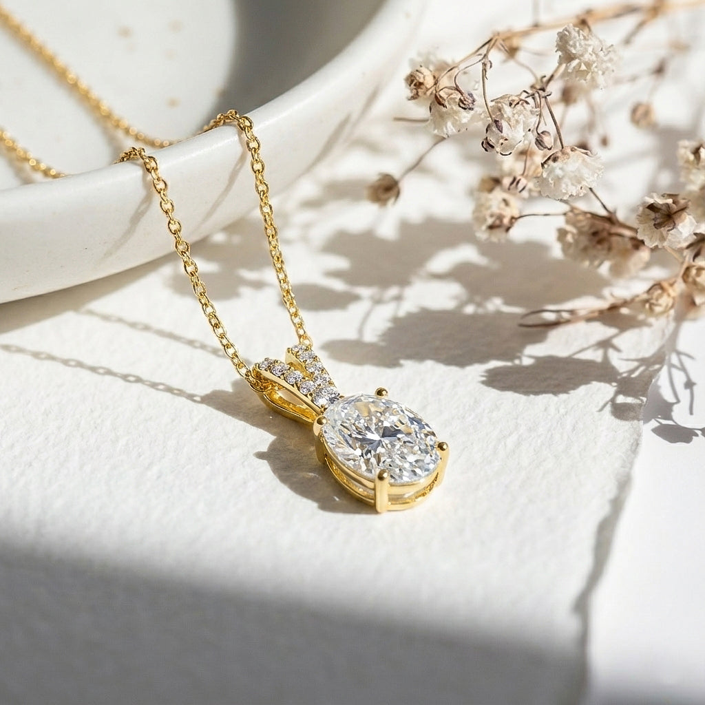 Add timeless sparkle with this Simulated Diamond Solitaire Pendant Necklace in yellow gold-plated brass. Featuring a 1.2 ct, 8×6 mm oval-cut simulated diamond (approx. 1.5 ct CZ accent), the pendant measures 15.81 × 6.84 mm and is expertly faceted for brilliant shine. It hangs from a 16"+2" adjustable cable chain with a secure lobster clasp. Lightweight at 4 grams with chain, this necklace is perfect for everyday elegance, special occasions, or gifting a classic diamond-inspired jewelry piece.