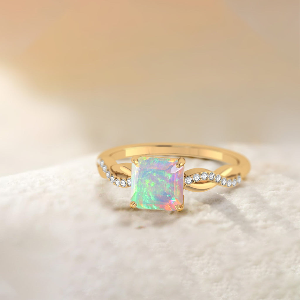 White OpalNatural White Opal 925 Sterling Silver Crossover Ring for Women. Elevate your jewelry collection with the breathtaking beauty of this Natural White Opal Crossover Ring. Featuring a dazzling 7mm square-cut White Opal gemstone weighing approximately 1.2 carats, this ring is a true masterpiece. Each stone showcases a stunning play of color, shifting hues with every glance, making it as unique as the woman who wears it. Expertly crafted from premium 925 sterling silver and plated in rich yellow gold, this ring combines luxury with durability. The sleek band and bold square shape give it a modern, high-end appeal that complements any outfit, from everyday chic to evening glam. Whether you're shopping for yourself or searching for a meaningful gift, this elegant ring makes the perfect choice.