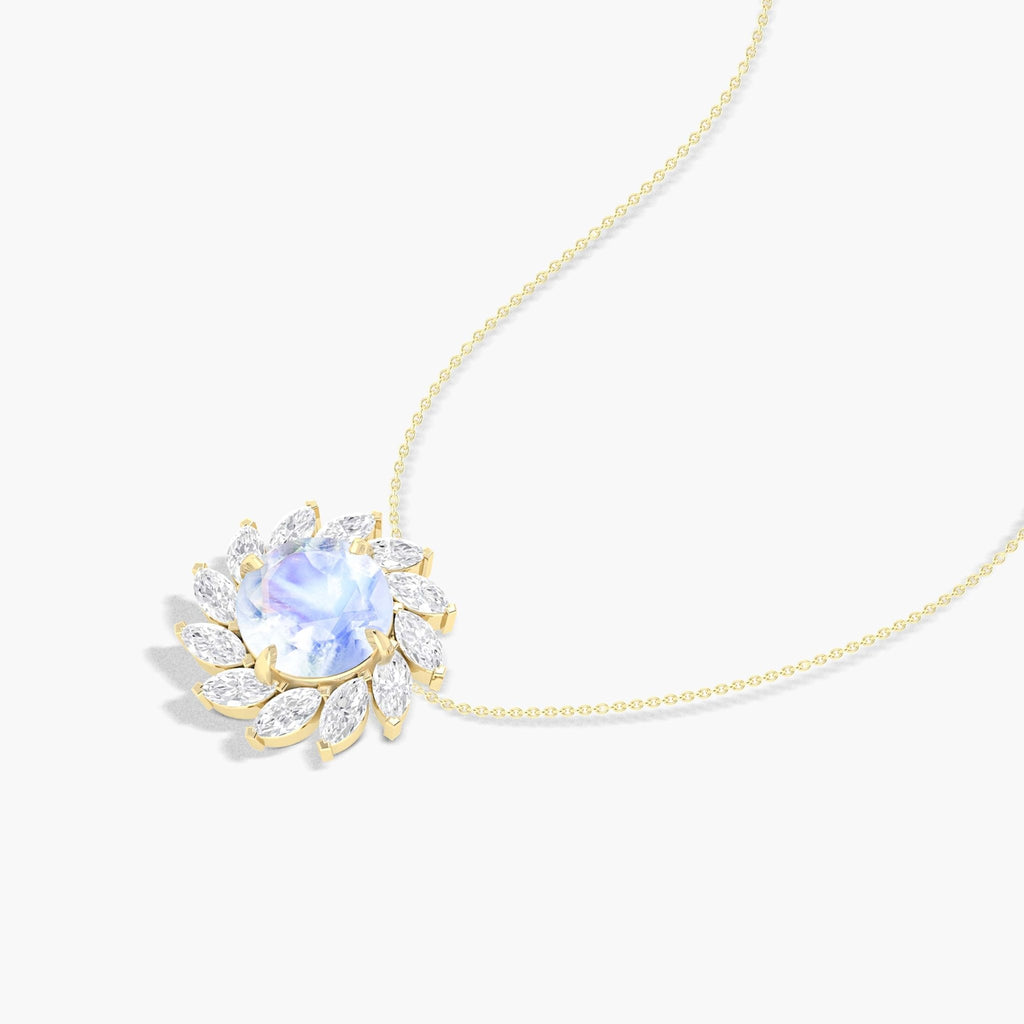 MoonstoneGOODSTONE JEWELS Sunflower Pendant Necklace, a stunning piece crafted for women who appreciate natural beauty and refined design. This exquisite necklace features a 7mm round natural moonstone (~1.2 carats), known for its mesmerizing play of colors and symbolic connection to creativity, passion, and protection. Set in high-quality 925 sterling silver, this pendant captures the essence of a sunflower in bloom radiant, joyful, and full of life. Perfect as a birthstone jewelry gift, this necklace makes a heartfelt statement for birthdays, anniversaries, Mother's Day, or simply to show someone how much they mean to you. The pendant hangs gracefully from a 16-inch cable chain, with an additional 2-inch extender for adjustable comfort and fit. Lightweight at just 3.20 grams, this necklace is both durable and comfortable for daily wear.
