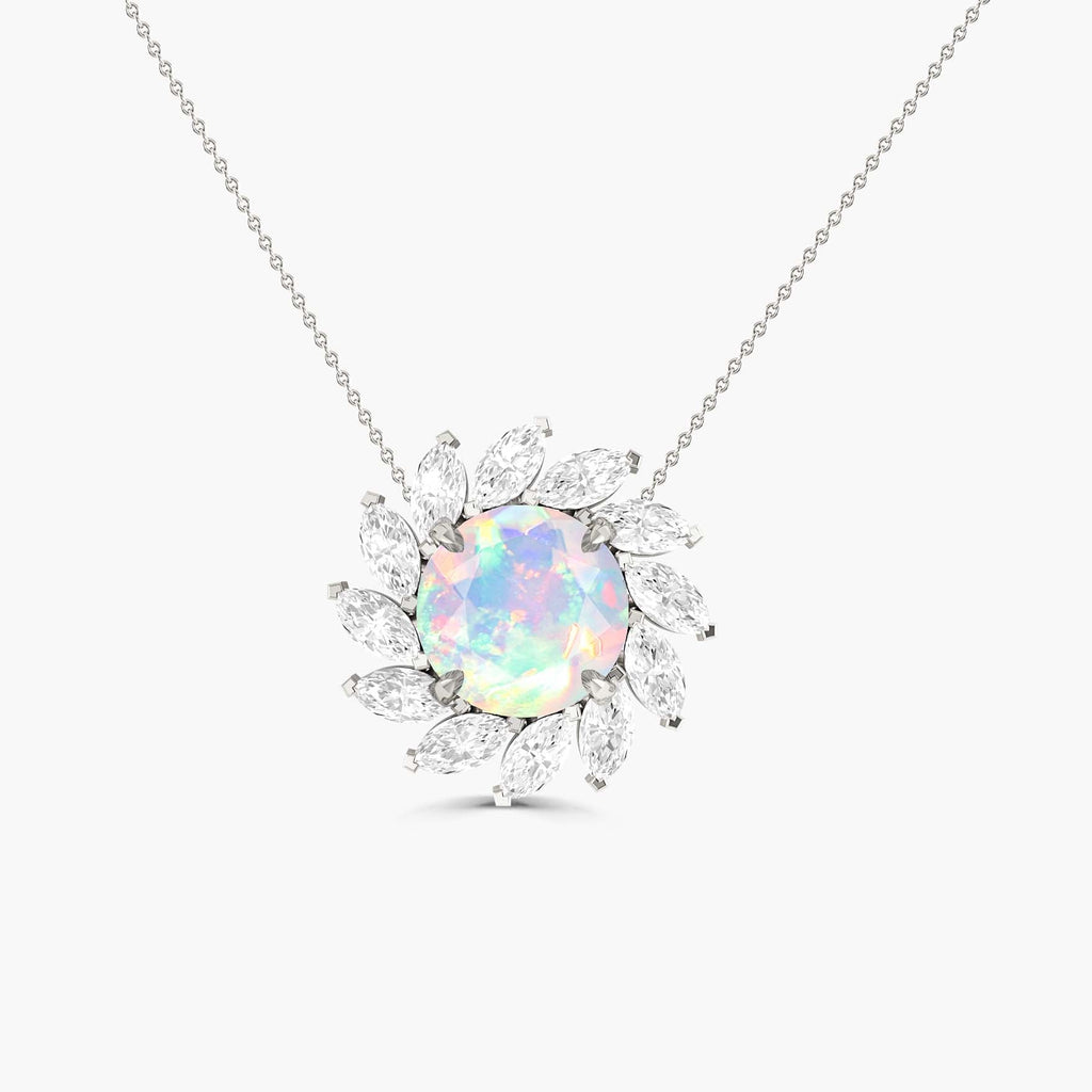 White OpalGOODSTONE JEWELS Sunflower Pendant Necklace, a stunning piece crafted for women who appreciate natural beauty and refined design. This exquisite necklace features a 7mm round natural white opal (~1.2 carats), known for its mesmerizing play of colors and symbolic connection to creativity, passion, and protection. Set in high-quality 925 sterling silver, this pendant captures the essence of a sunflower in bloom radiant, joyful, and full of life. Perfect as a birthstone jewelry gift, this necklace makes a heartfelt statement for birthdays, anniversaries, Mother's Day, or simply to show someone how much they mean to you. The pendant hangs gracefully from a 16-inch cable chain, with an additional 2-inch extender for adjustable comfort and fit. Lightweight at just 3.20 grams, this necklace is both durable and comfortable for daily wear.