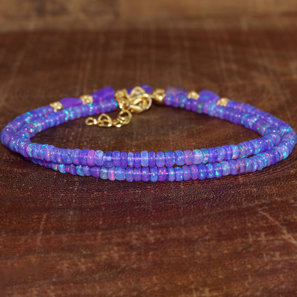 Natural Lavender Opal Tumble Beaded Necklace, a stunning piece designed to captivate and complement any style. The necklace features beautiful 4x5mm smooth rondelle beads and 5x7mm tumble beads made from genuine lavender opal, known for its iridescent glow that changes with the light. Each bead is unique, giving you a one-of-a-kind piece of art.