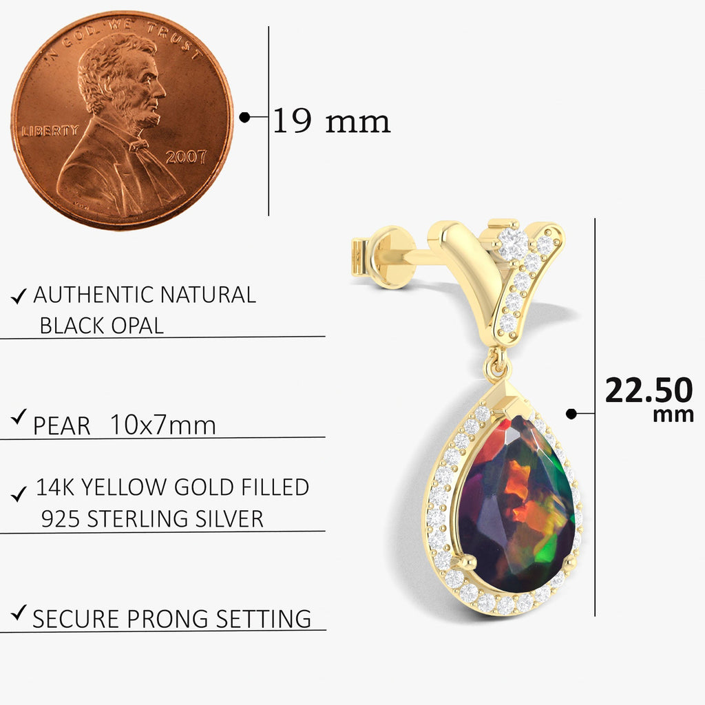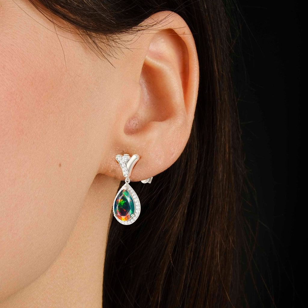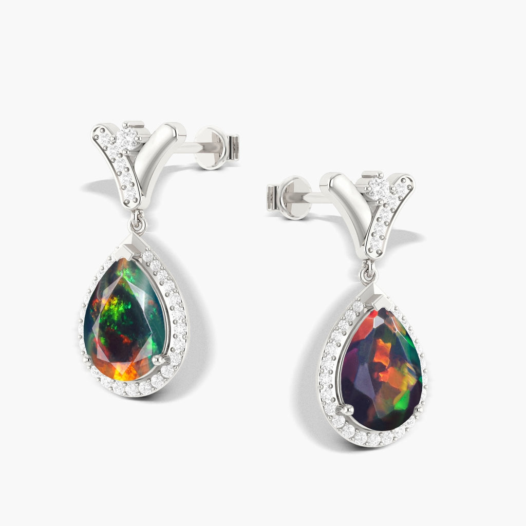 Black OpalGOODSTONE JEWELS 925 Sterling Silver 'V' Shape Drop Earrings, a stunning fusion of craftsmanship, color, and charm. These luxurious earrings feature a captivating mix of natural opal stone, beautifully set in sterling silver frame that reflects refined beauty. Each earring boasts a 10x7mm pear-cut gemstone face, offering a total stone weight of 2.8 carats, with a total length of 22.50mm. The secure push-back closure ensures a comfortable fit, making these earrings ideal for both everyday wear and special occasions. Designed in a chic 'V' shape, the vibrant stones are arranged to catch light from every angle, enhancing your natural elegance.