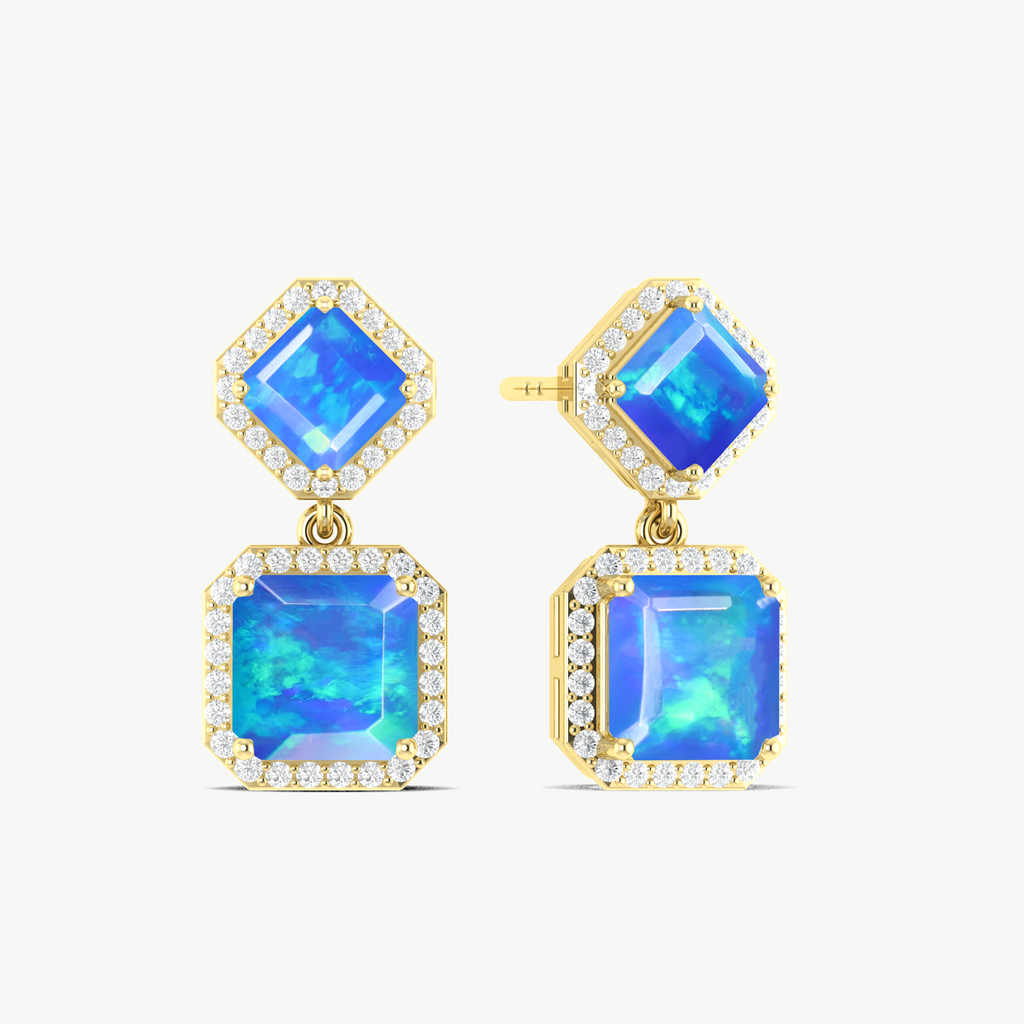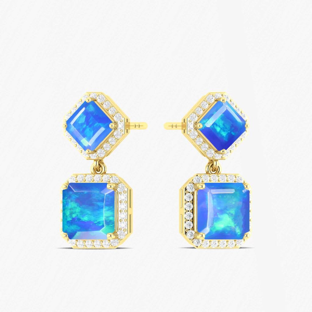 Blue OpalElevate your style with these 7x5mm blue opal octagon halo drop earrings, set in 925 sterling silver. Featuring 3.5ct of radiant blue opal surrounded by a sparkling halo, they catch the light beautifully. Perfect for weddings, special occasions, or adding a touch of sophisticated glamour to any outfit.