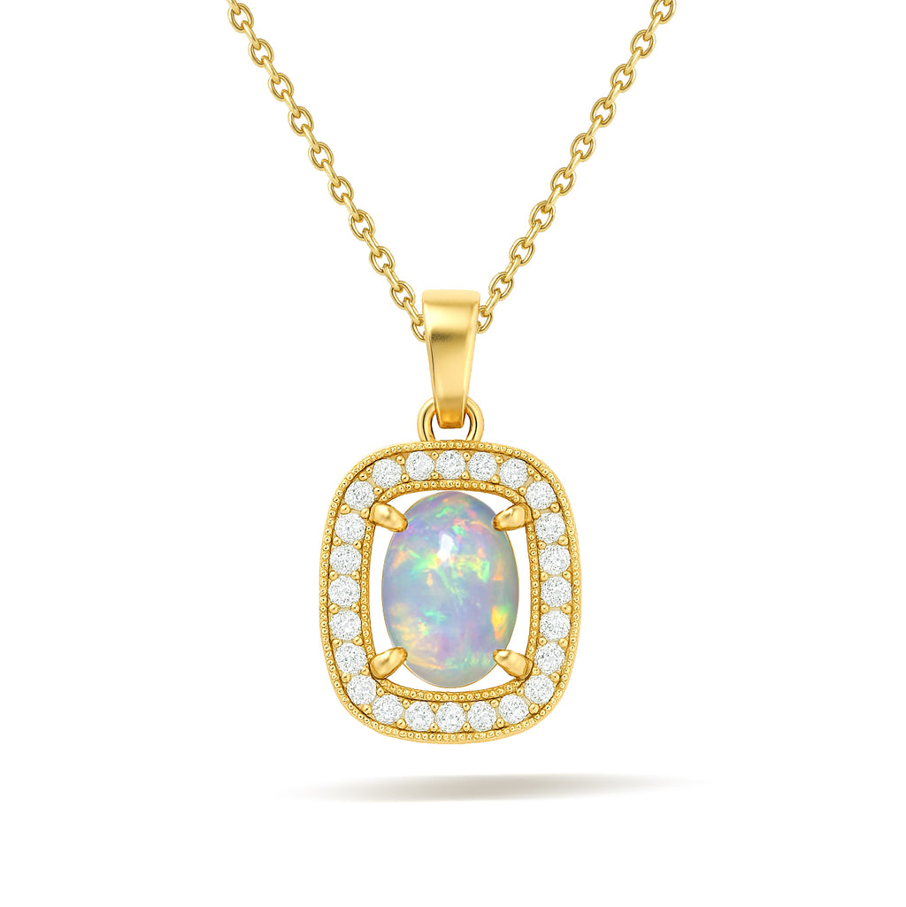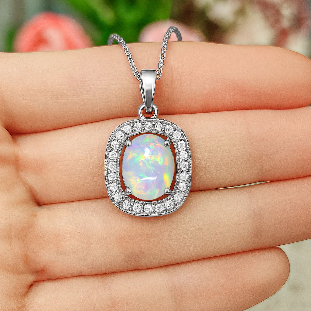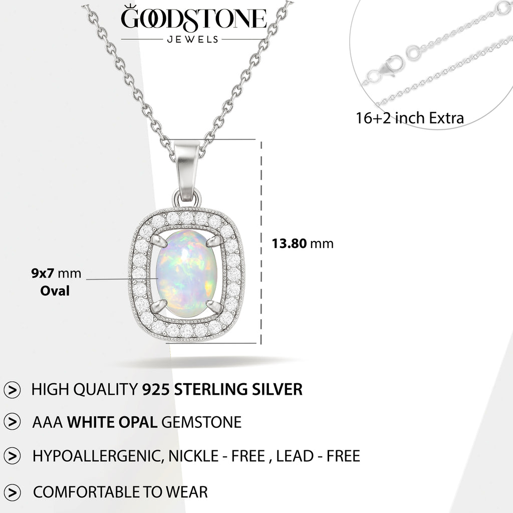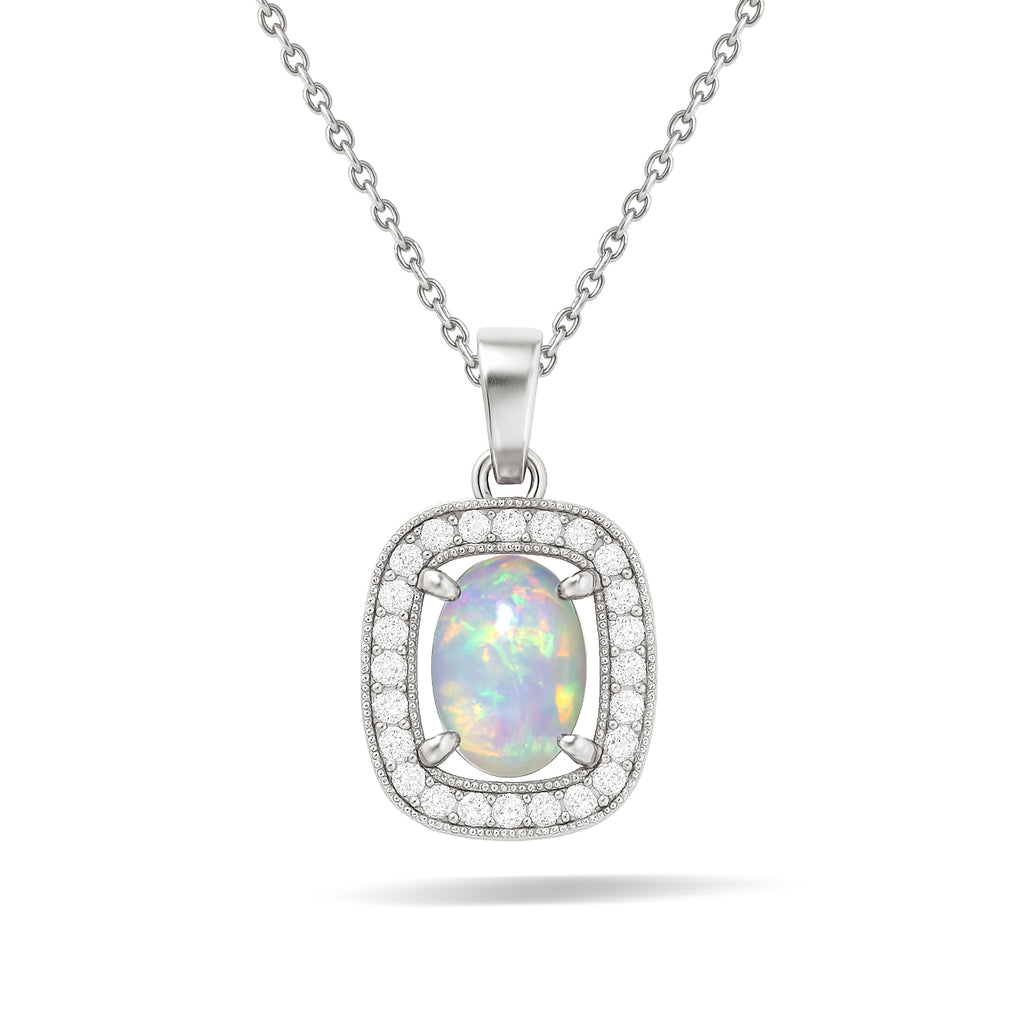 White OpalElevate your style with this elegant White Opal Oval Halo Pendant Necklace, crafted in premium 925 Sterling Silver. The smooth 9x7 mm opal (1.2 carat) sits beautifully within a classic halo frame, offering a radiant and timeless look. Measuring 12.80 x 11.80 mm, it comes with a 16" + 2" adjustable cable chain and secure lobster clasp. Lightweight at 1.65 g, this pendant adds a graceful touch to both everyday wear and special occasions. Perfect for gifting or personal elegance.