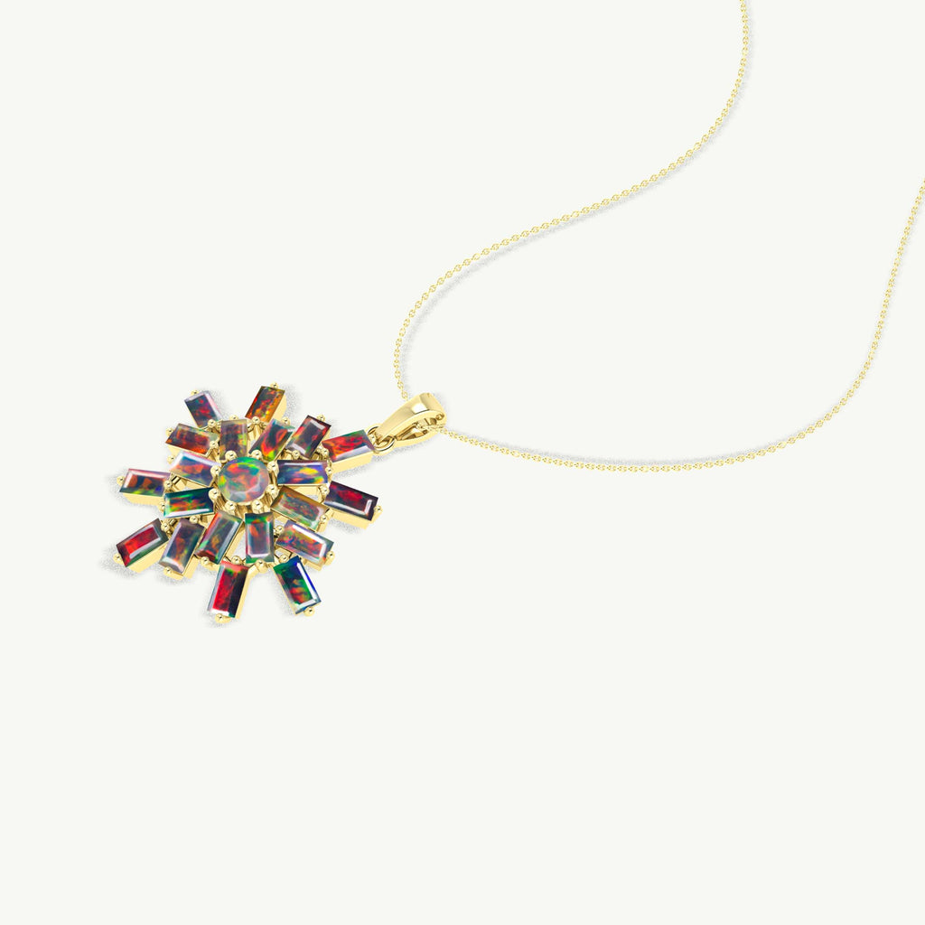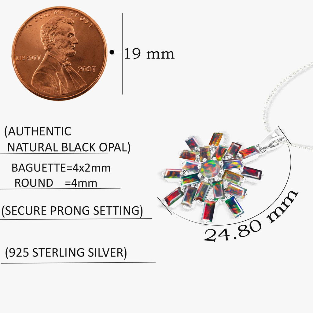 Black OpalThe Black Opal Snowflake Pendant Necklace in 925 Sterling Silver showcases a striking total gemstone weight of 4.5 CT, crafted with natural black opal stones in an intricate snowflake face design. The pendant is set with twenty baguette-cut opals measuring 2 x 4 mm and one round-cut opal measuring 4 mm, forming a symmetrical and eye-catching snowflake pattern. The pendant measures 24.87 x 24.87 mm and is paired with a 16-inch cable chain plus a 2-inch extender, secured with a sturdy lobster clasp. Made from solid 925 sterling silver, the necklace has an approximate total weight of 6 grams, offering a substantial yet comfortable feel.