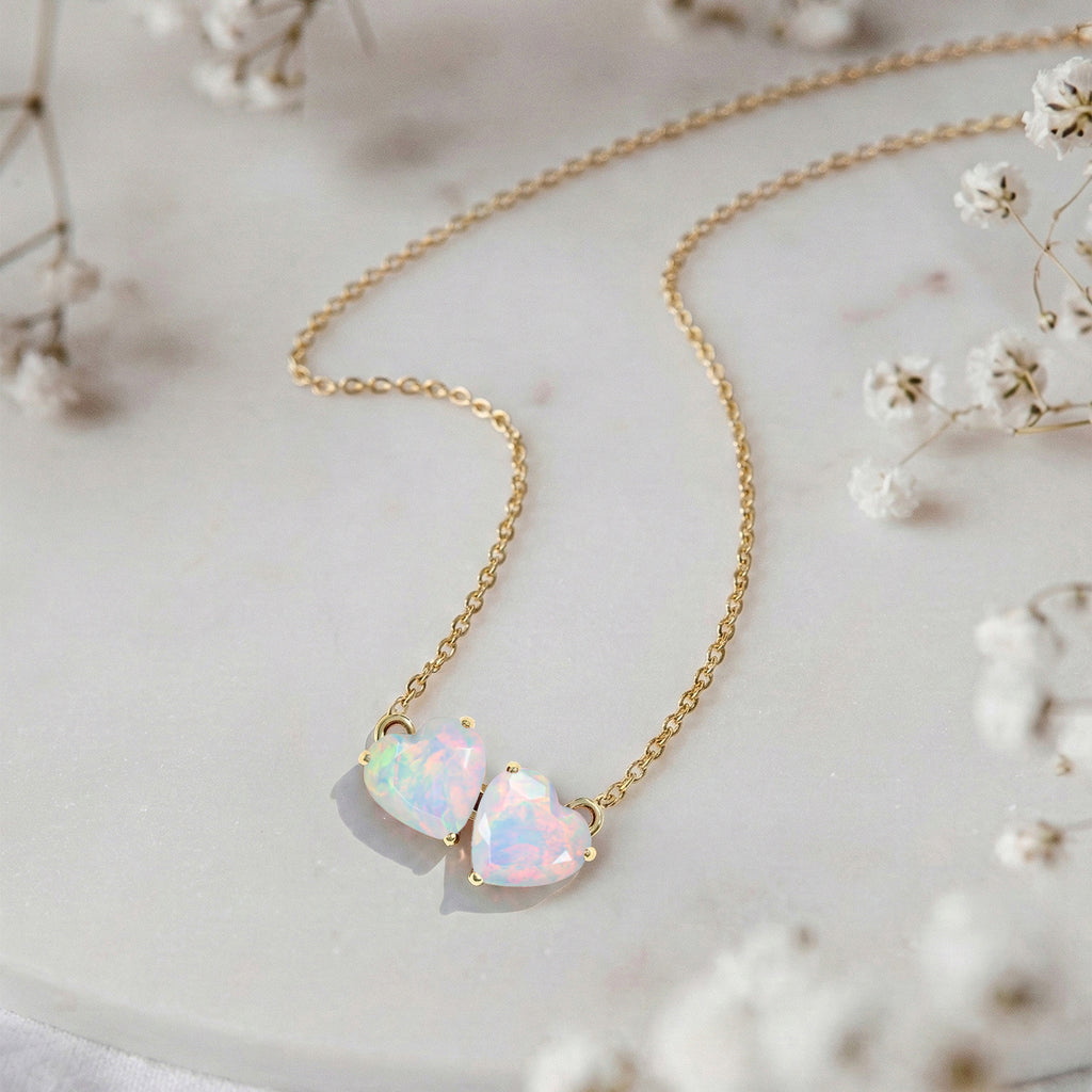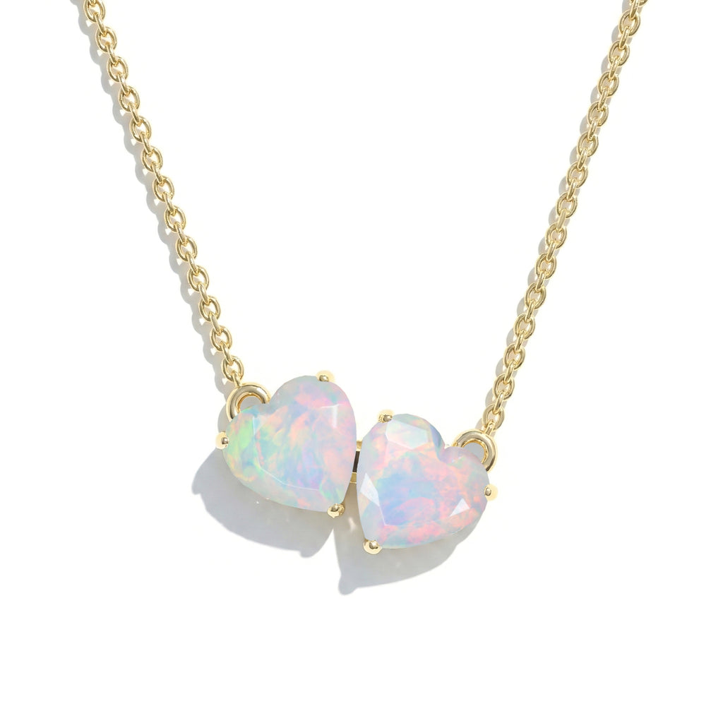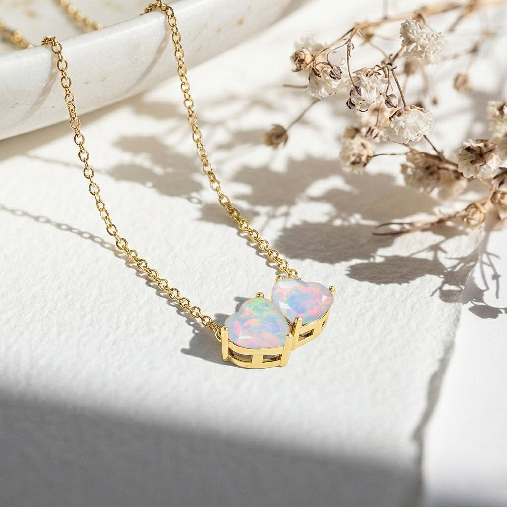 Add a touch of luminous beauty with this White Opal Double Heart Necklace in yellow gold-plated brass. Two 5 mm faceted white opals (1.3 ct) create a 7.90 × 11.87 mm heart pendant, suspended on a 16" + 2" adjustable cable chain. Lightweight at 3.30 g, ideal for layering or as a statement piece. This white opal heart necklace radiates elegance and charm.