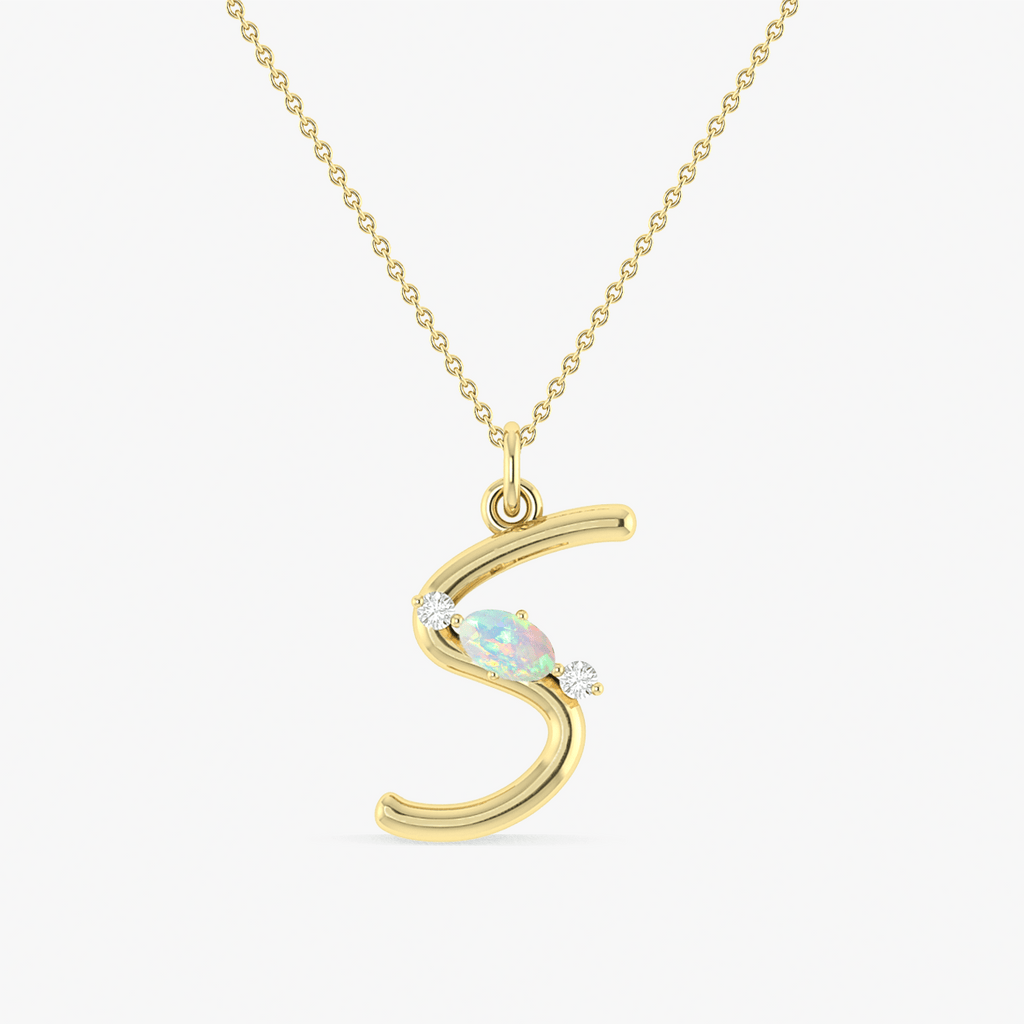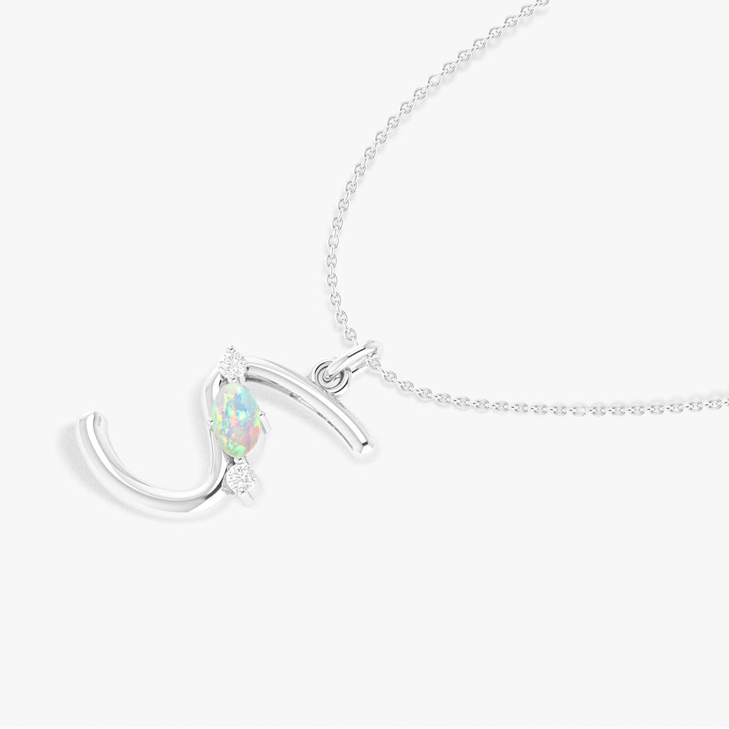White OpalIntroducing the White Opal Stone Initial Pendant! This beautiful necklace features oval gemstone of stunning white opal and two round zircons with Capital "S" initial. Wear it to add a touch of elegance and love to any outfit. Perfect for special occasions or everyday wear, this pendant is sure to dazzle and delight.