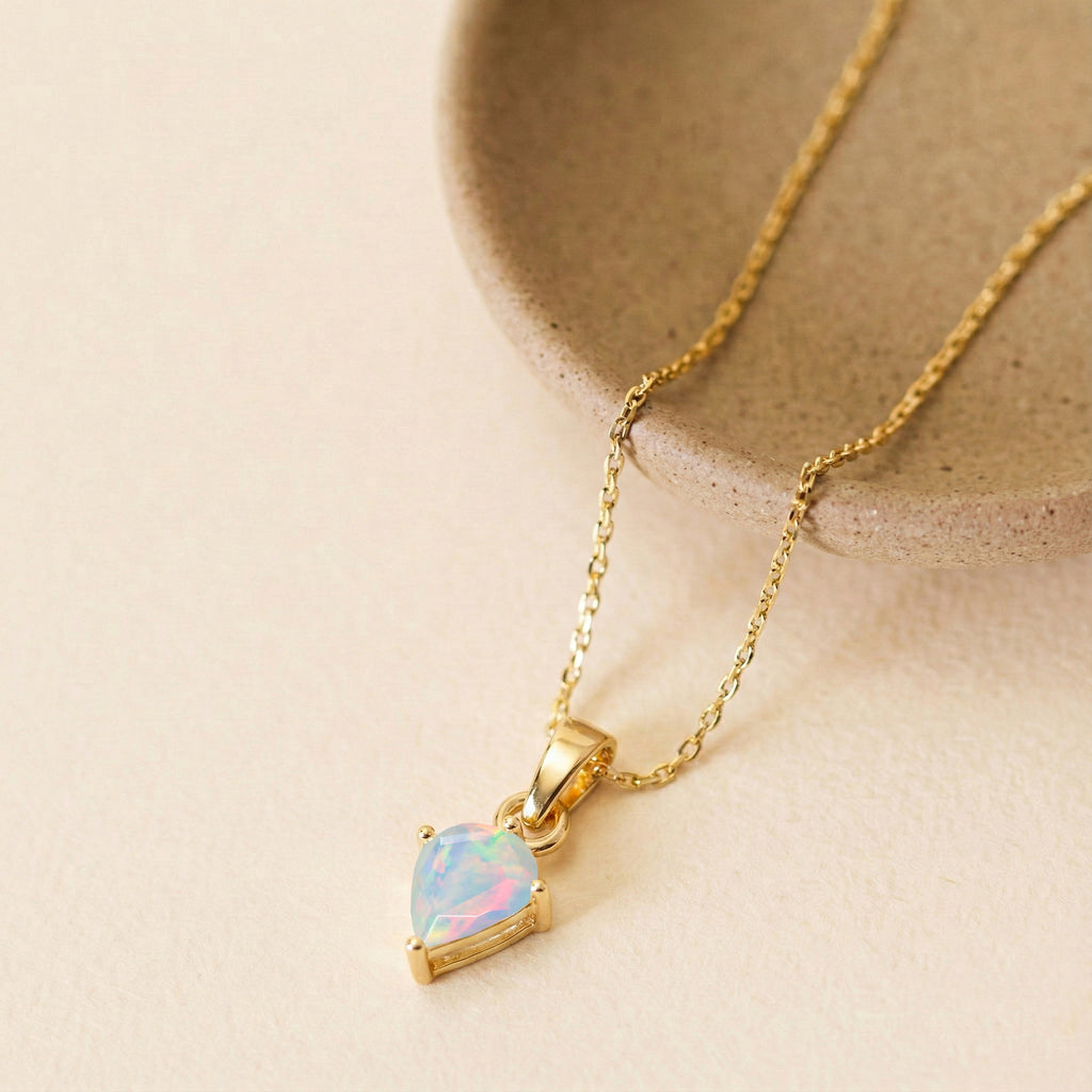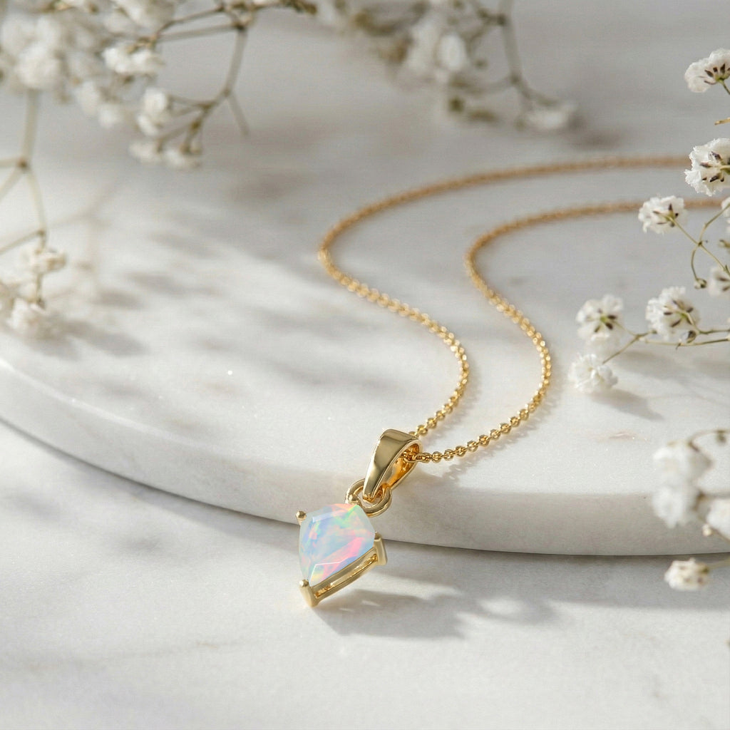 Add soft, luminous beauty to your jewelry collection with this White Opal Kite Solitaire Pendant Necklace in yellow gold-plated brass. Featuring a 1.40 ct, 9×7 mm kite-cut white opal, the pendant measures 18.20 × 7.40 mm and displays a delicate play of light. It hangs from a 16"+2" adjustable cable chain with a secure lobster clasp. Lightweight at 3.7 grams with chain, this necklace is perfect for everyday wear, layering, or gifting a timeless opal jewelry piece.