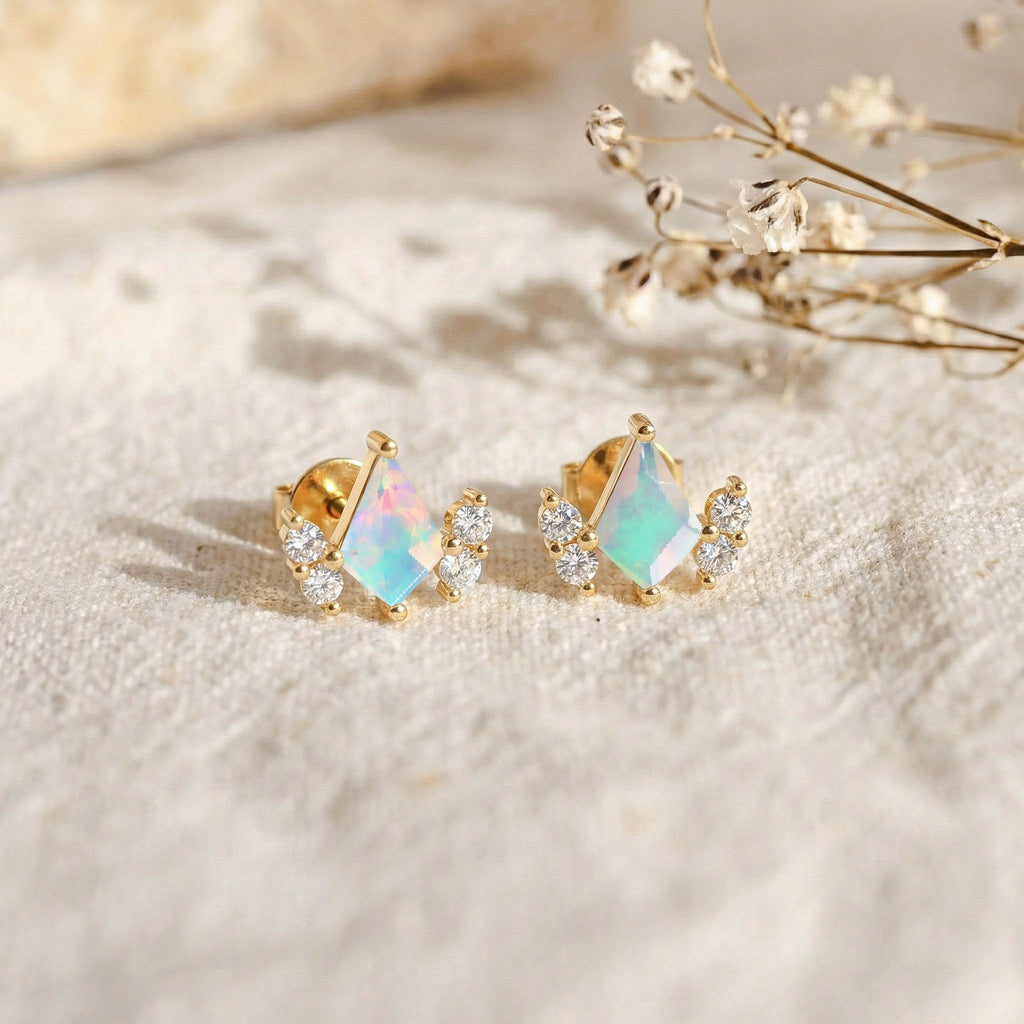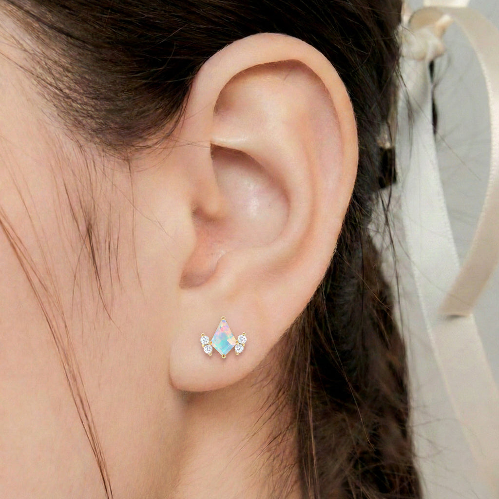 Crafted in solid 925 sterling silver, these White Opal Kite Stud Earrings showcase two 6x4 MM faceted kite-cut stones totaling approximately 1 CT. The luminous opals reflect captivating iridescent hues. Sized at 7.83 x 6.86 MM and weighing 1.05 grams, these studs provide secure and elegant wear for any occasion.