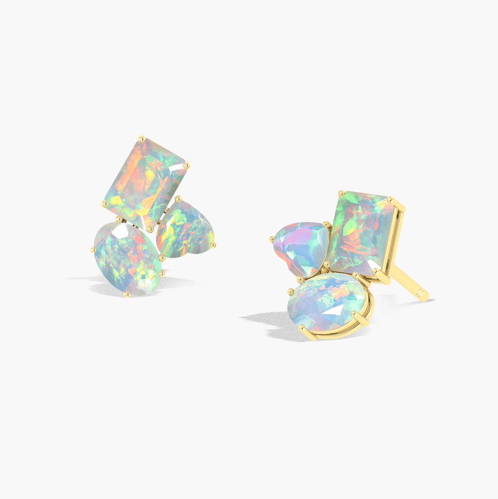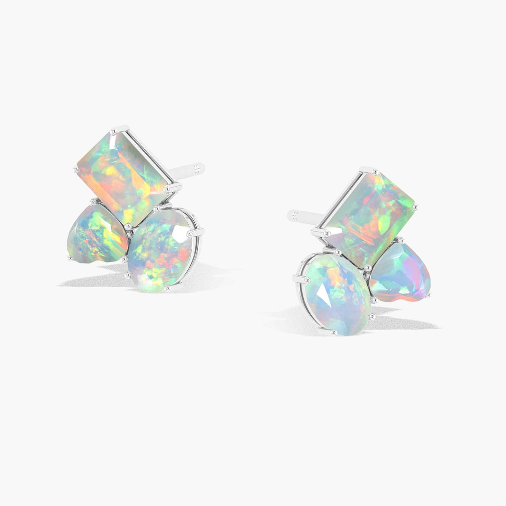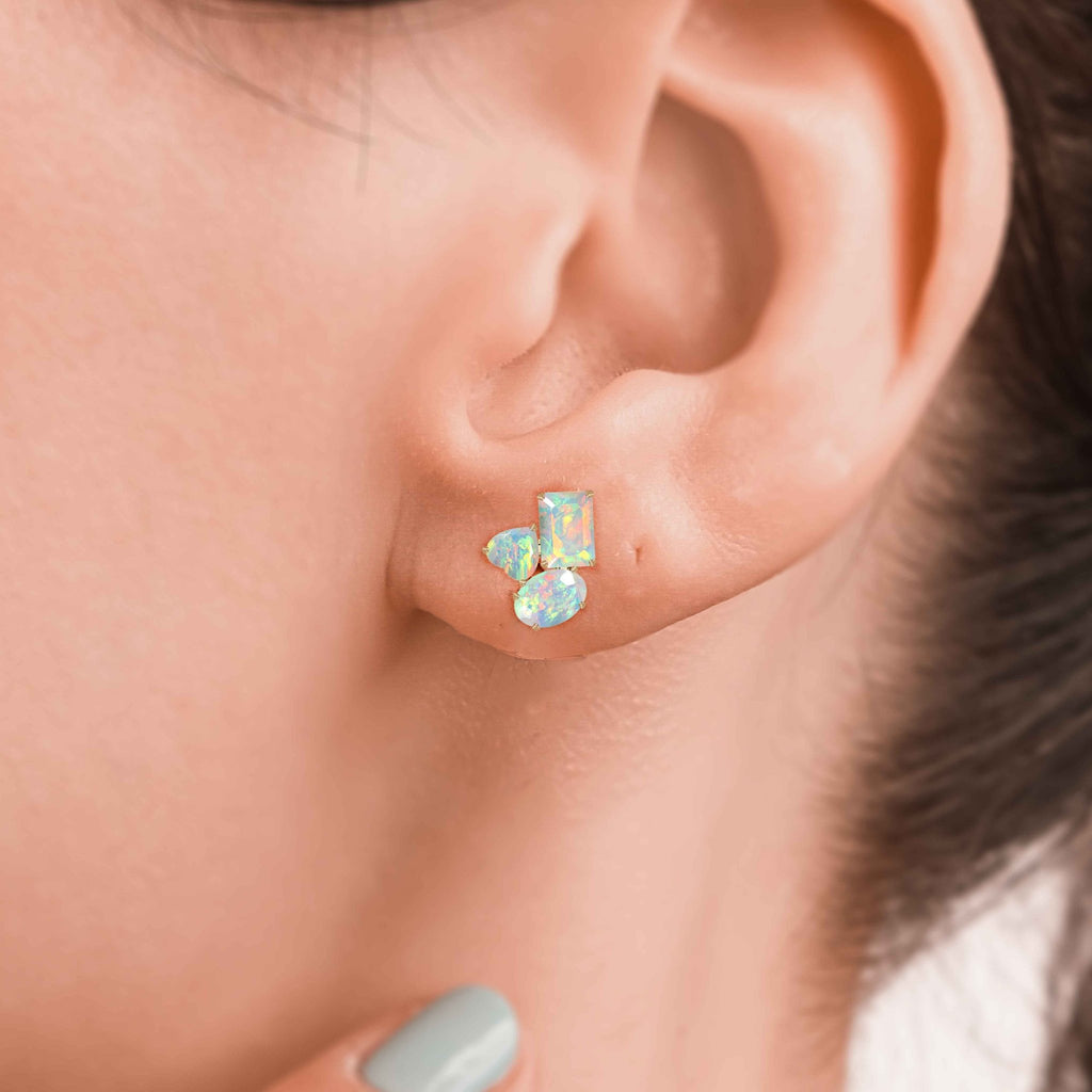 White OpalIntroducing the White Opal Multi Stone Stud Earrings! This beautiful earring features three different shape gemstone of stunning white opal. Wear it to add a touch of elegance and love to any outfit. Perfect for special occasions or everyday wear, this earring is sure to dazzle and delight.