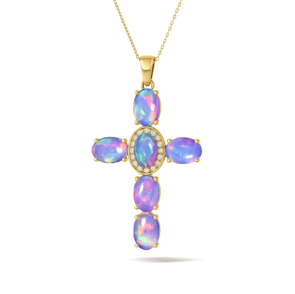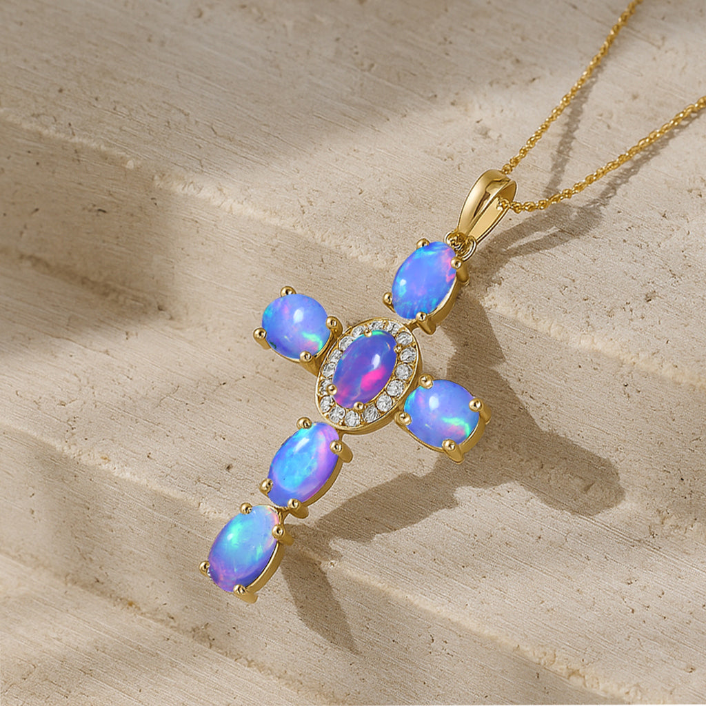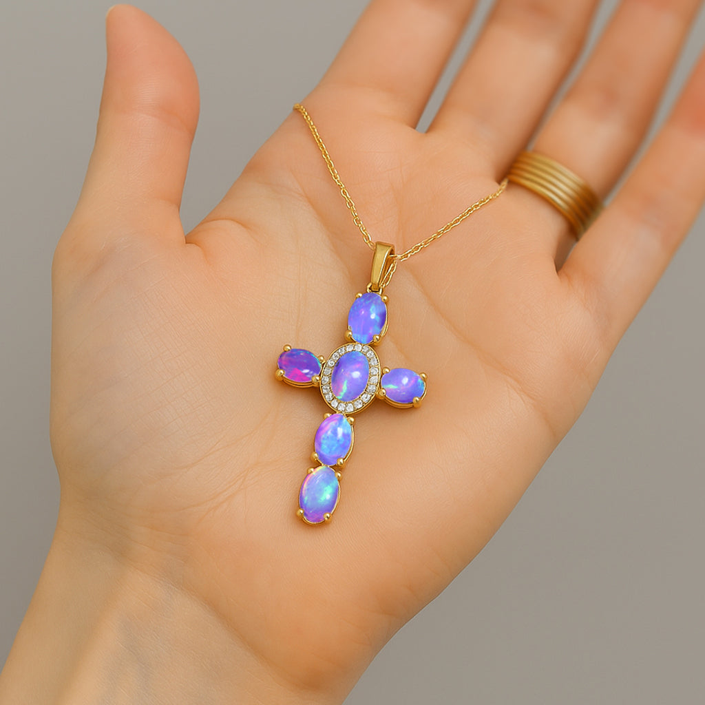 Lavender OpalElevate your spiritual style with this exquisite Lavender Opal Oval Holy Cross Pendant Necklace, beautifully crafted in 925 Sterling Silver for timeless elegance. Featuring a luminous 6x4 mm smooth oval Lavender Opal totaling 2.40 carats, the pendant showcases a radiant cross design measuring 34.19 x 19.98 mm, offering a graceful blend of devotion and sophistication. Suspended on a 16" + 2" adjustable cable chain with a secure lobster clasp, this 3.50 gm approx necklace is perfect for daily wear, gifting, or meaningful occasions. A luxurious statement piece for women who appreciate spiritual jewelry with a refined, modern touch