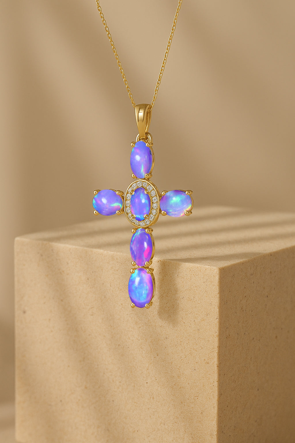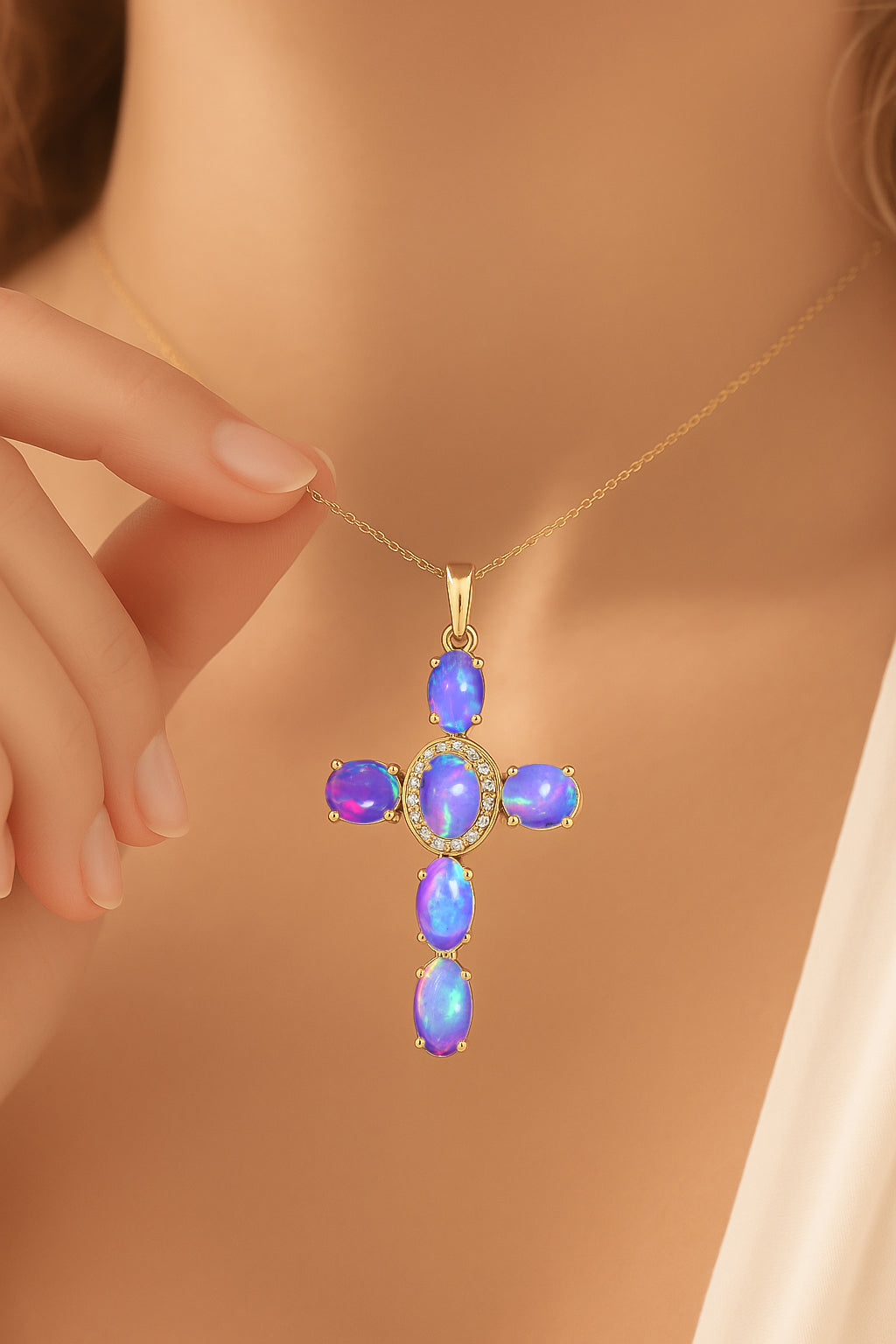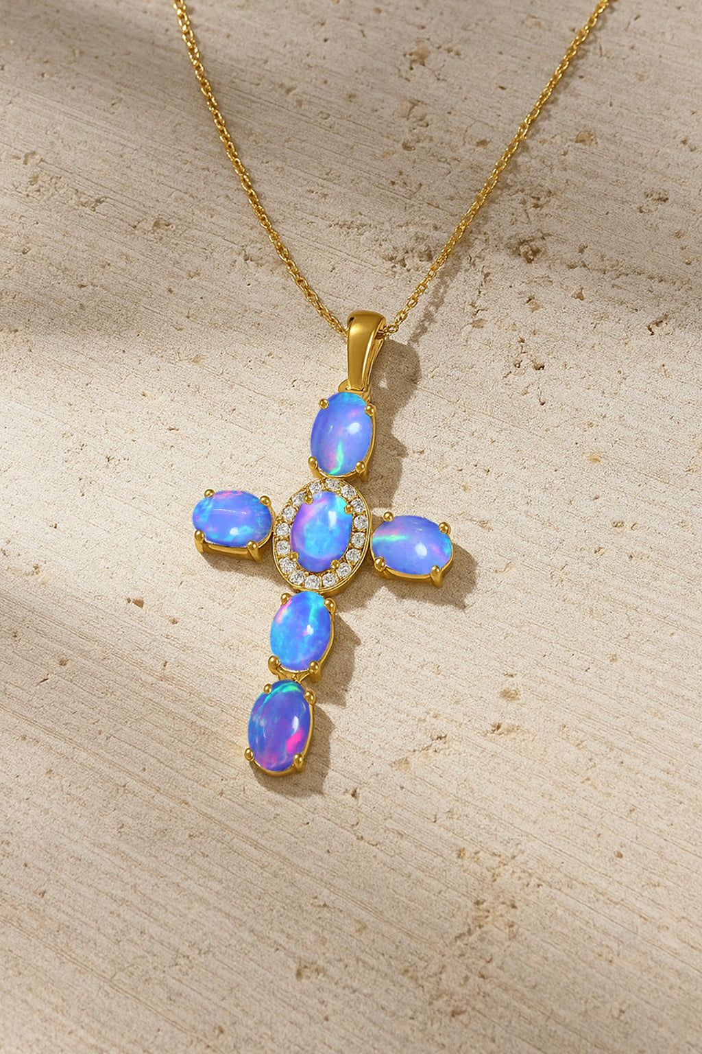 Lavender OpalElevate your spiritual style with this exquisite Lavender Opal Oval Holy Cross Pendant Necklace, beautifully crafted in 925 Sterling Silver for timeless elegance. Featuring a luminous 6x4 mm smooth oval Lavender Opal totaling 2.40 carats, the pendant showcases a radiant cross design measuring 34.19 x 19.98 mm, offering a graceful blend of devotion and sophistication. Suspended on a 16" + 2" adjustable cable chain with a secure lobster clasp, this 3.50 gm approx necklace is perfect for daily wear, gifting, or meaningful occasions. A luxurious statement piece for women who appreciate spiritual jewelry with a refined, modern touch