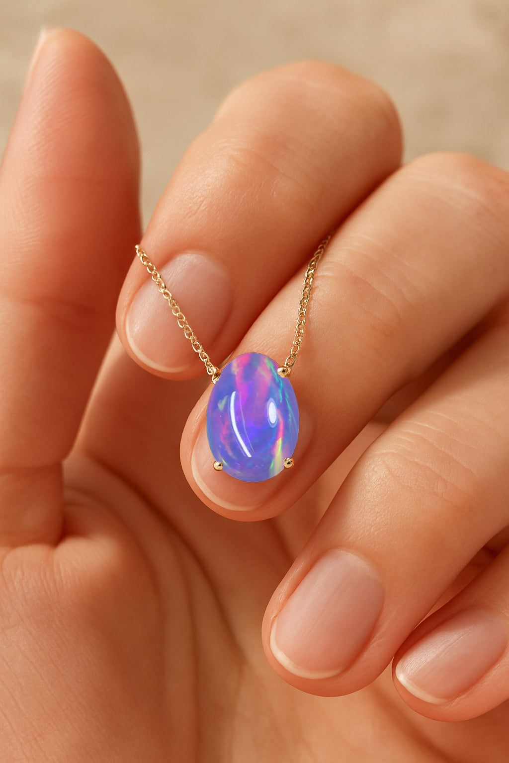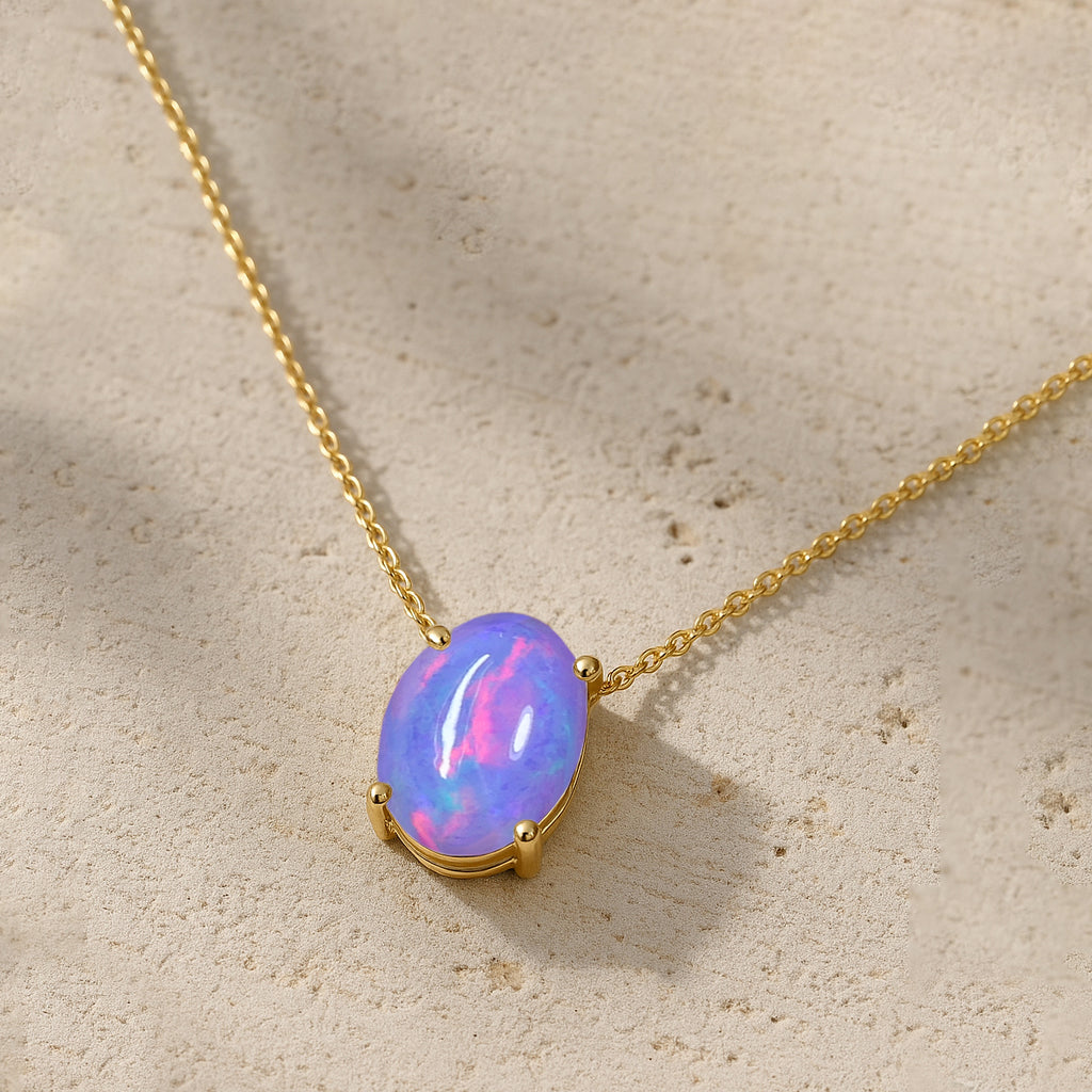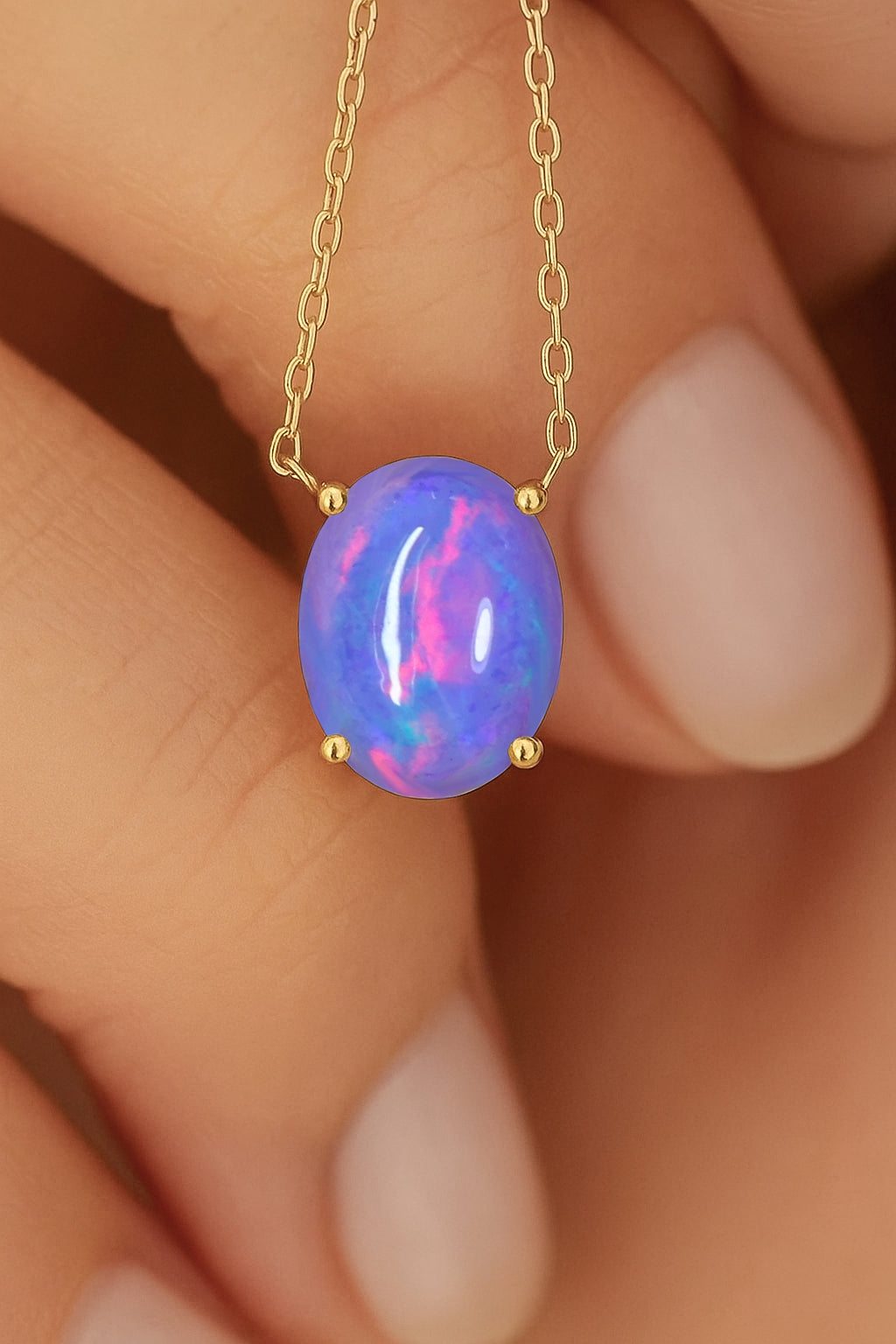 Lavender OpalElevate your everyday elegance with this Lavender Opal Oval Stone Pendant Necklace, beautifully crafted in premium 925 Sterling Silver. The smooth 8x6 mm opal gemstone (0.9 carat) showcases a soft, luminous glow, adding a touch of sophistication to any look. Its refined pendant size of 8.30x6.30 mm is perfectly paired with a 16" + 2" adjustable cable chain secured by a lobster clasp. Lightweight at approximately 0.95 gm, this necklace is ideal for daily wear or gifting. A timeless accessory that combines simplicity, charm, and modern style.