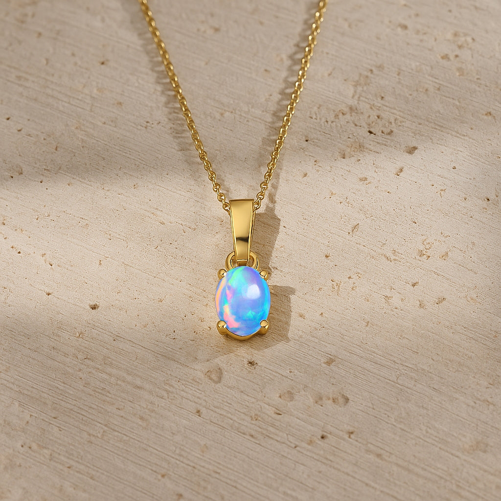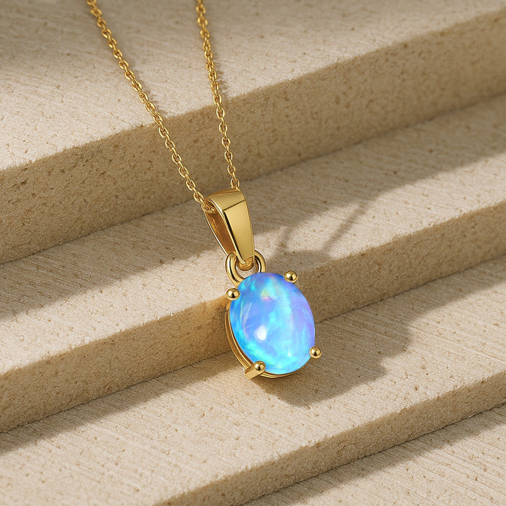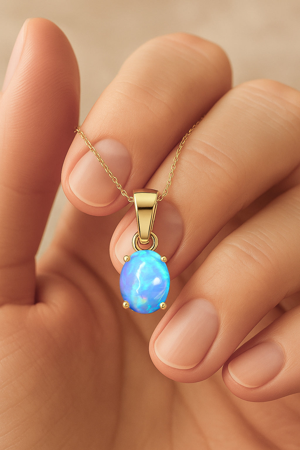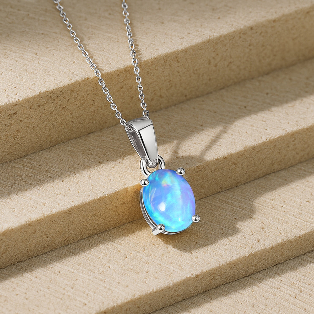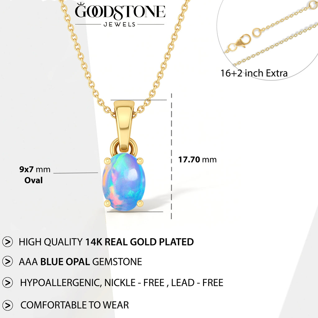 Blue OpalMake a bold statement with this Blue Opal Oval Teardrop Pendant Necklace, crafted in premium 925 sterling silver. The smooth 9×7 mm oval-cut blue opal, weighing 1.20 carat, reveals captivating flashes of color within its dark, mysterious sheen. The 17.70×7.00 mm pendant hangs from a 16″ + 2″ adjustable cable chain, offering comfort and versatility. With an approximate weight of 1.60 g, this piece blends elegance and modern allure perfect for any jewelry collection.