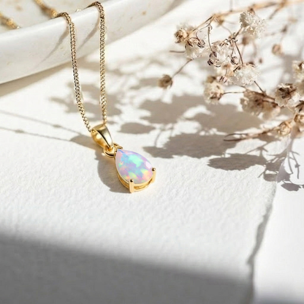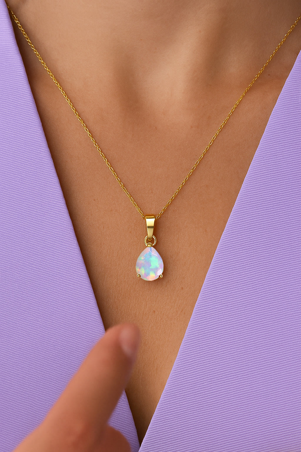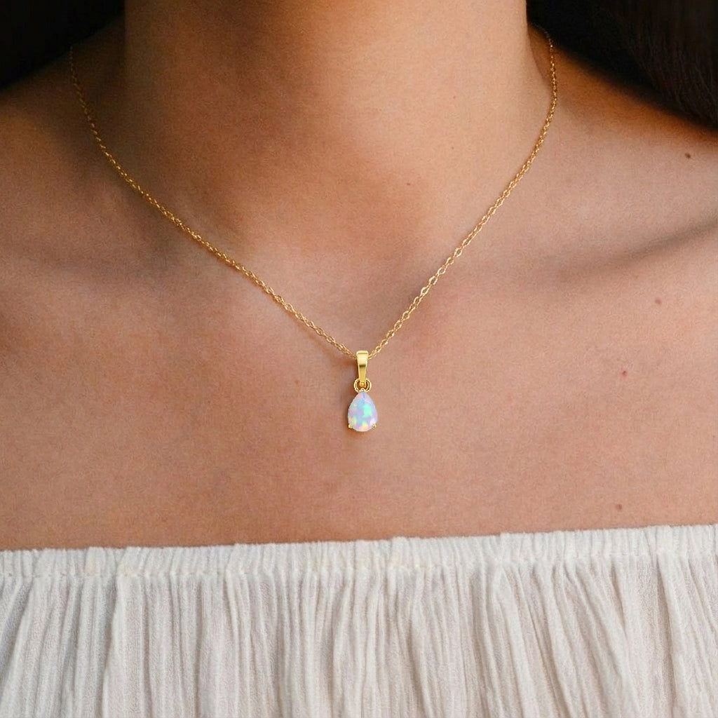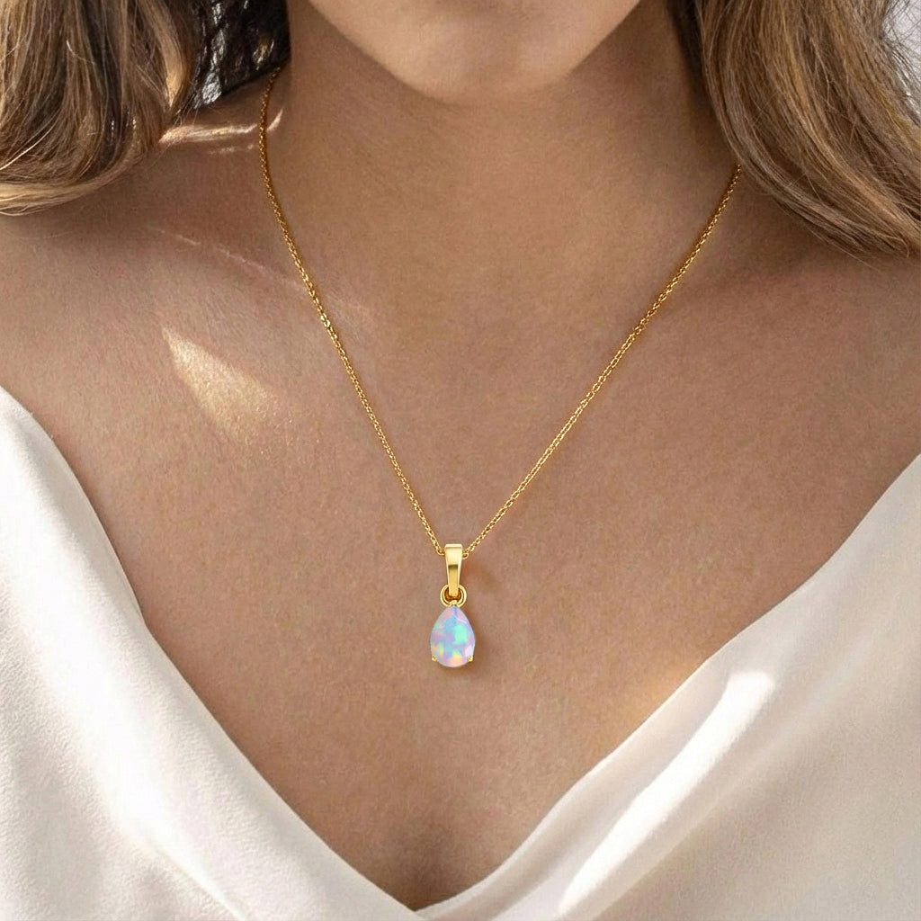 White Opal Pear Solitaire Teardrop Pendant Necklace in Yellow Gold Plated 9x7 MM 1.4ct
