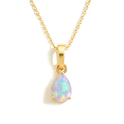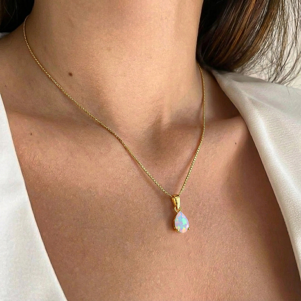 Add a touch of ethereal elegance with this White Opal Pear Solitaire Teardrop Pendant Necklace. Featuring a faceted 9x7 mm pear-shaped white opal (approx. 1.4 carats), this delicate pendant is set in yellow gold plated brass for a warm, polished finish. The 18.40 x 7 mm teardrop hangs gracefully from a 16” + 2” adjustable cable chain with a secure lobster clasp. A timeless accessory perfect for everyday wear or as a thoughtful gift.