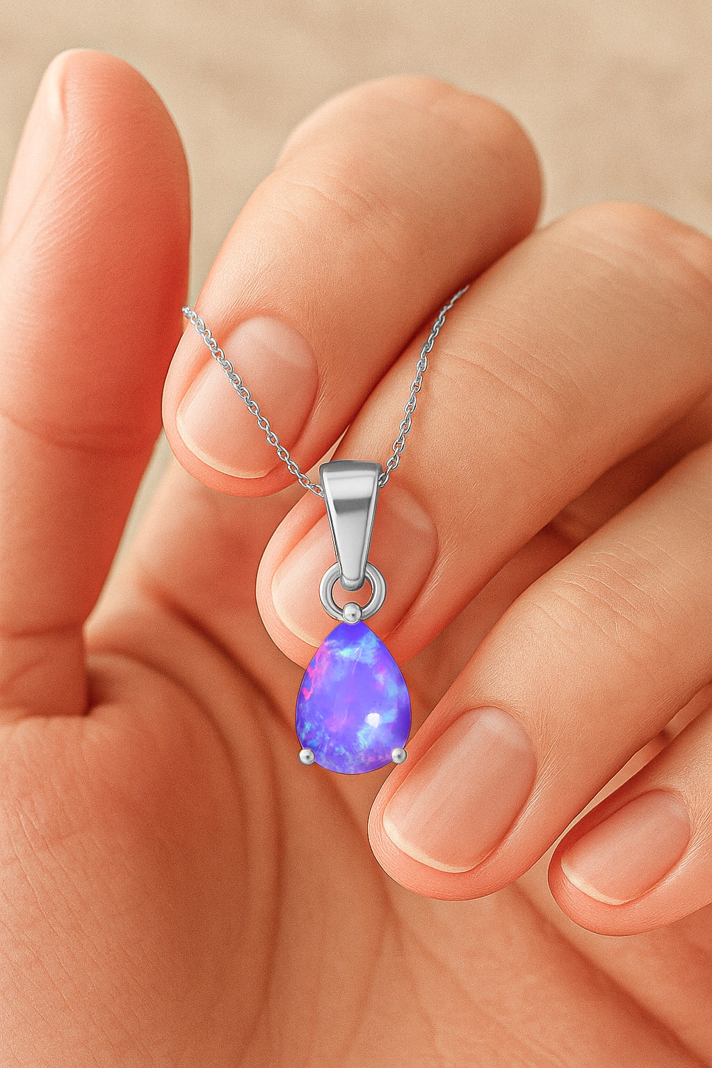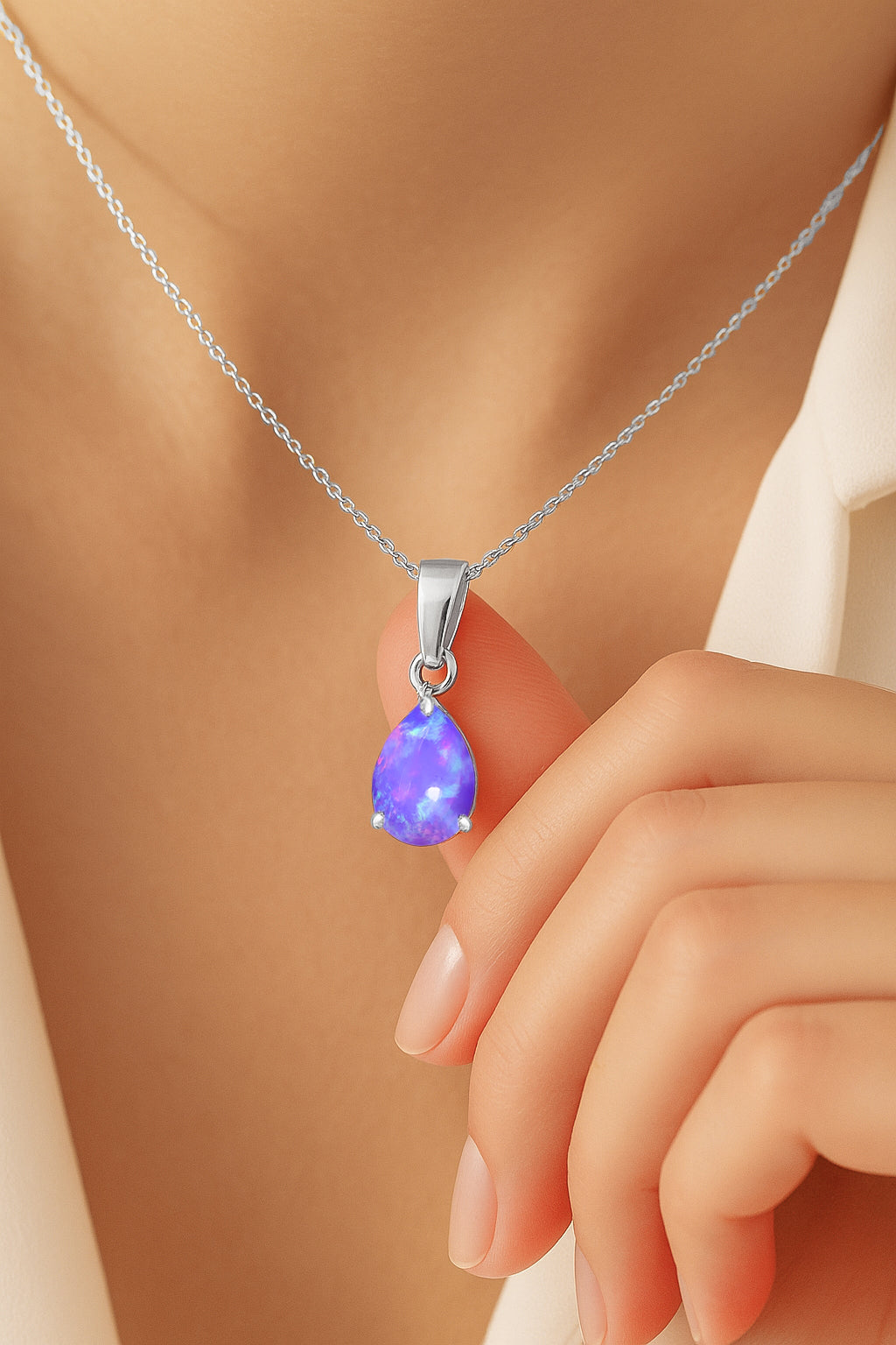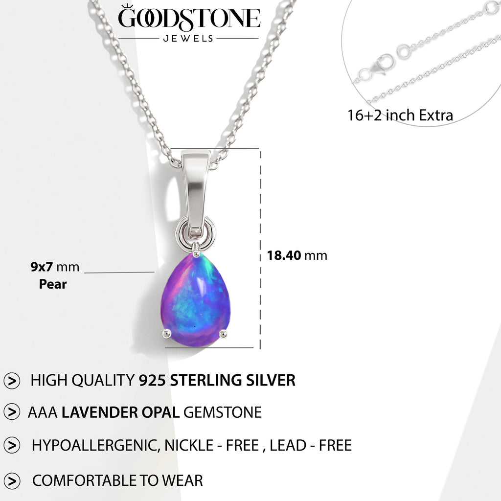 Lavender OpalEnhance your style with this elegant Lavender Opal Pear Teardrop Pendant Necklace, crafted in fine 925 sterling silver. The pendant features a smooth 9×7 mm pear-cut opal weighing 1.20 carat, celebrated for its luminous, iridescent glow. Measuring 18.40×7.00 mm, it hangs beautifully from a 16″ + 2″ adjustable cable chain. With an approximate weight of 1.35 g, this lightweight yet striking piece adds a touch of soft radiance to both everyday looks and special occasions.