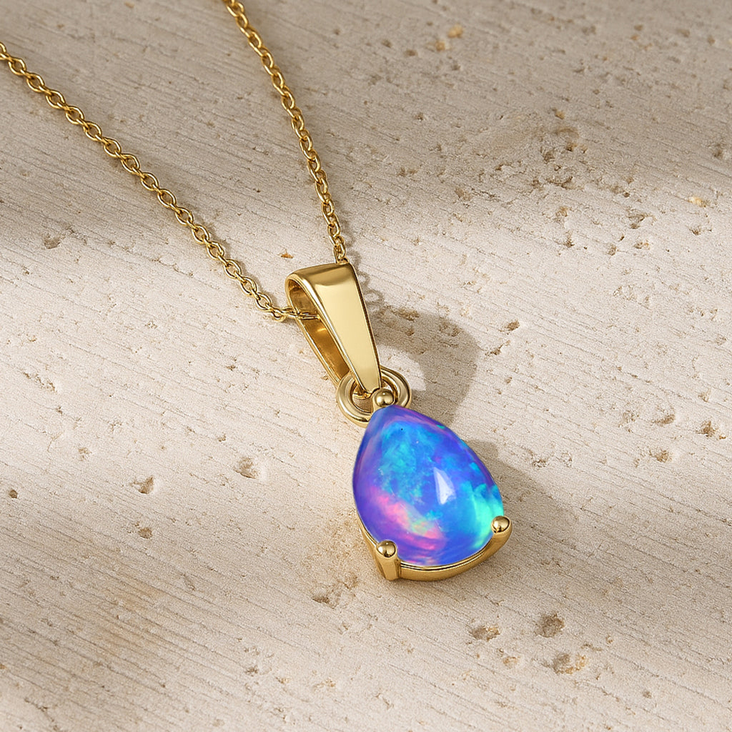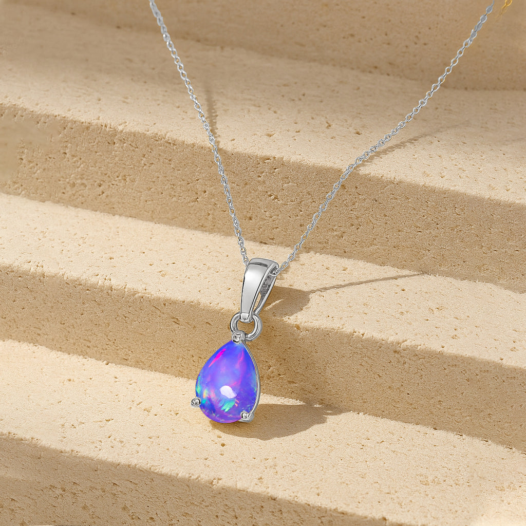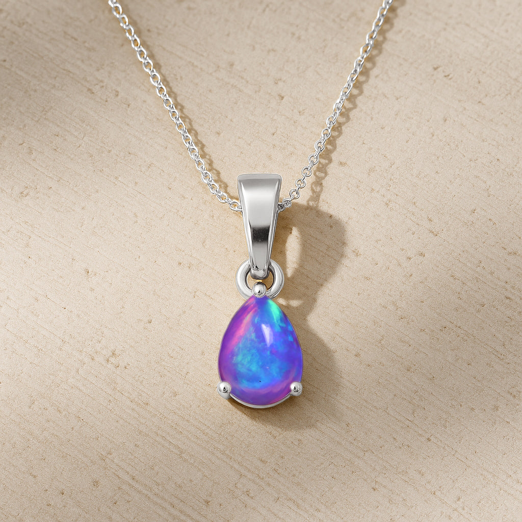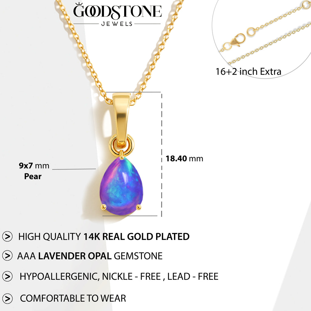 Lavender OpalEnhance your style with this elegant Lavender Opal Pear Teardrop Pendant Necklace, crafted in fine 925 sterling silver. The pendant features a smooth 9×7 mm pear-cut opal weighing 1.20 carat, celebrated for its luminous, iridescent glow. Measuring 18.40×7.00 mm, it hangs beautifully from a 16″ + 2″ adjustable cable chain. With an approximate weight of 1.35 g, this lightweight yet striking piece adds a touch of soft radiance to both everyday looks and special occasions.