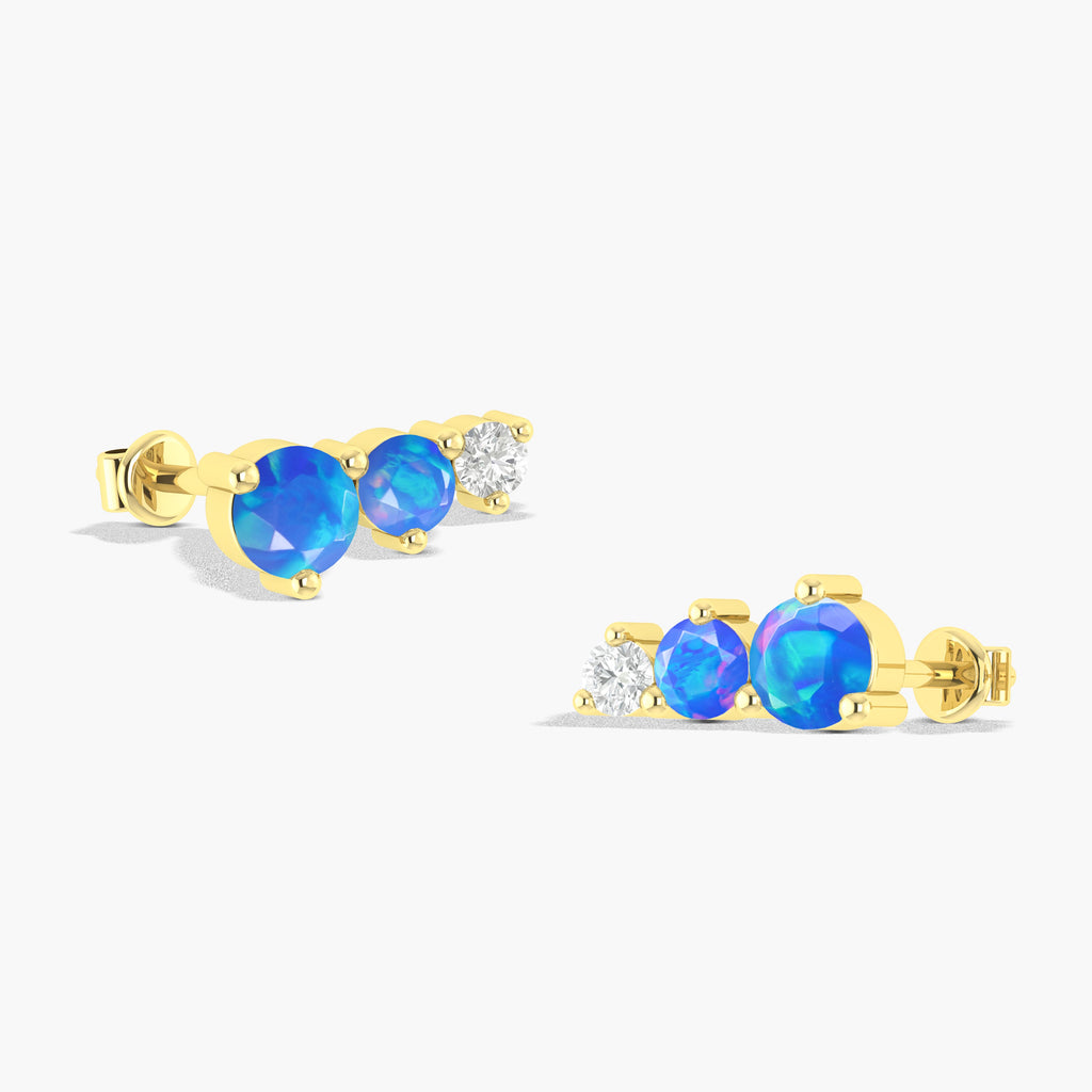Blue OpalElegant blue opal round stud earrings crafted in 925 sterling silver, featuring 4mm and 3mm opals accented with 2mm sparkling CZ. Total 1.1ct weight with a secure push-back closure. Lightweight and stylish, perfect for everyday wear or subtle elegance.