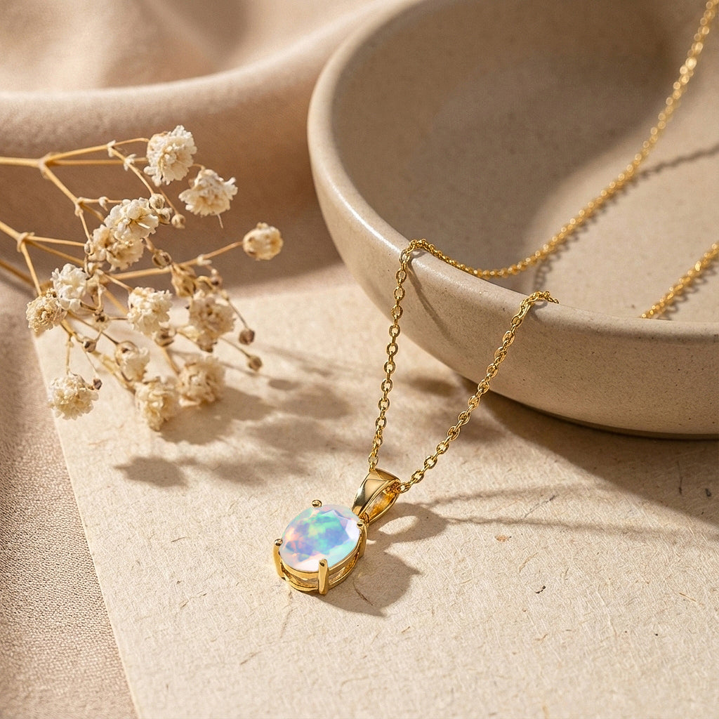 Add subtle elegance with this White Opal Solitaire Pendant Necklace in yellow gold plated brass. Featuring a luminous 1.4ct oval-cut white opal (9x7 mm) with a sparkling faceted finish, this classic solitaire design symbolizes purity and timeless beauty. The pendant measures 17.70 x 7 mm and hangs from a 16” + 2” adjustable cable chain with a secure lobster clasp. Lightweight at approximately 3.8 grams with chain, it’s perfect for everyday sophistication or as a thoughtful gift for birthdays, anniversaries, and special occasions.