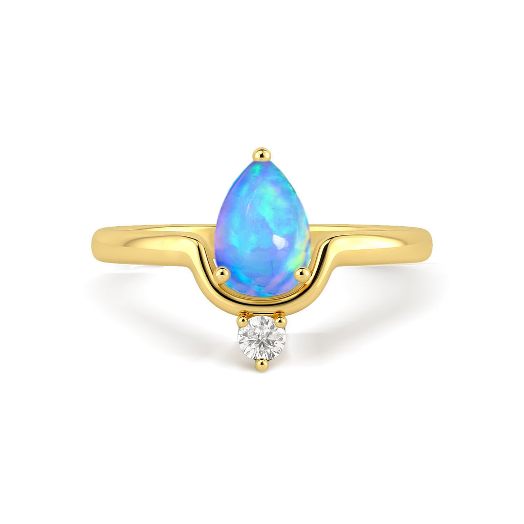 Blue OpalElevate her jewelry collection with this enchanting wishbone chevron ring, a graceful fusion of modern design and timeless sentiment. Featuring a smooth-cut natural blue opal in a pear shape alongside a sparkling round cubic zirconia, this elegant duo (7×5 mm, 0.6 ct) is set in a sleek V-shaped band inspired by the popular chevron trend. The opal’s mesmerizing play of color—fiery flashes that shift with movement—makes it a captivating symbol of individuality and beauty. As October’s birthstone, the blue opal adds deeper meaning, making this ring an ideal gift for birthdays, anniversaries, or meaningful milestones. Expertly crafted from 925 sterling silver and finished in rich yellow gold plating, the ring weighs just 2.35 grams. Its polished surface is hypoallergenic and resistant to everyday wear, ensuring comfort and long-lasting shine. The open wishbone-style silhouette makes it perfect for stacking with other rings or wearing solo for a minimalist yet expressive look.